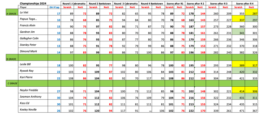 | B Grade nett | Viet Lo | 306 | Steve Hill | 326 |