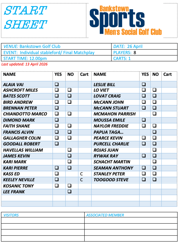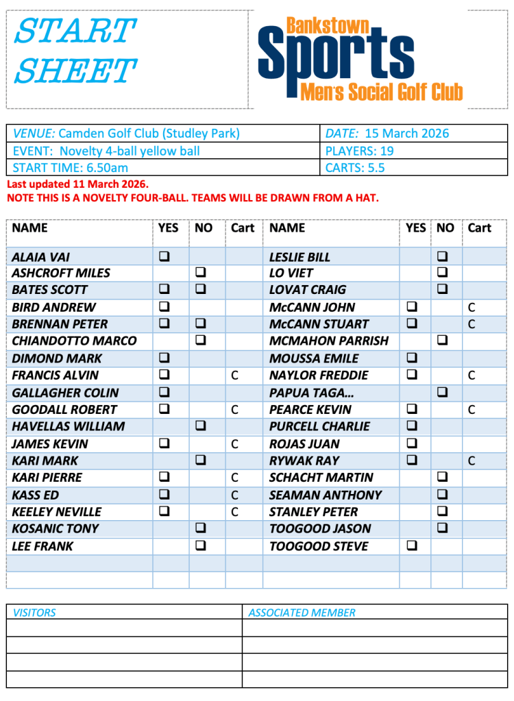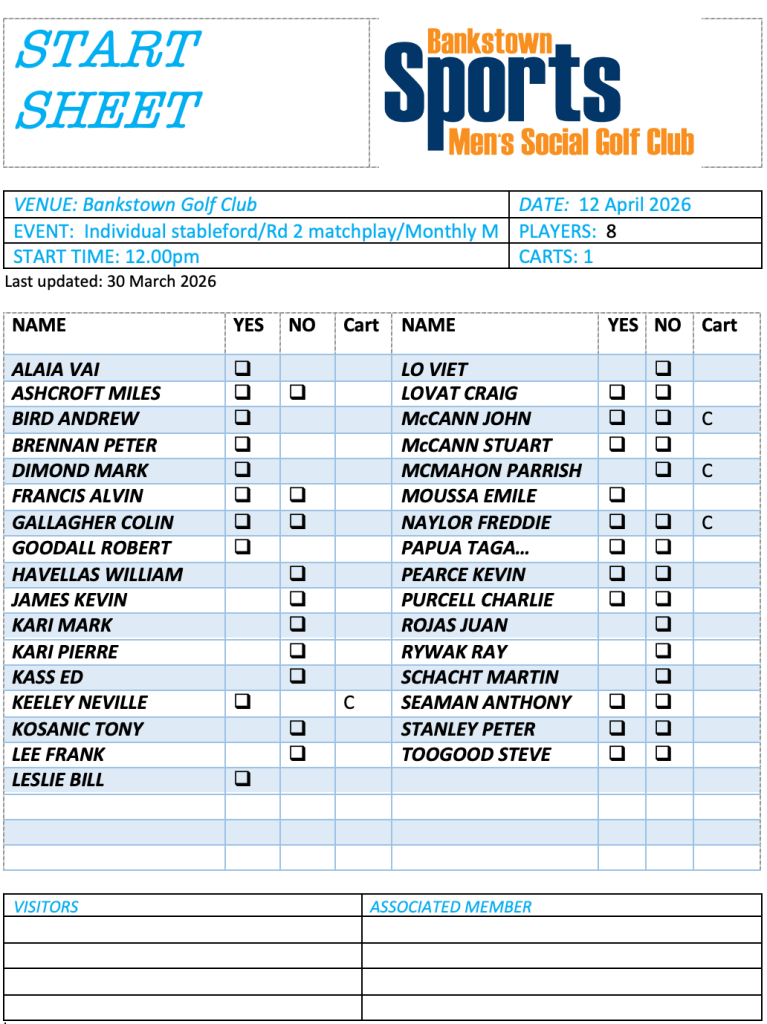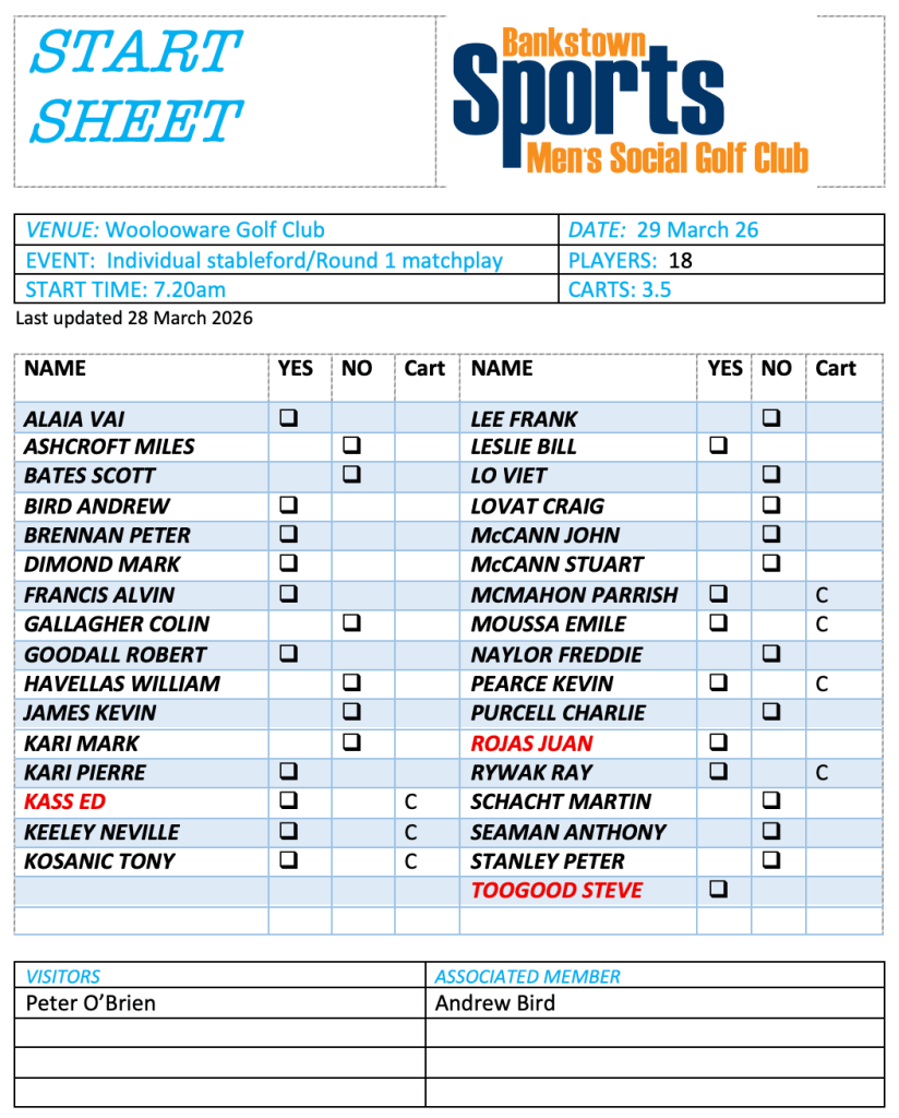 The start sheet for Bankstown is shown below. In order to do the Also Rans matchplay draw I need to know your intention to play as soon as possible. Please check that your intentions are shown correctly.