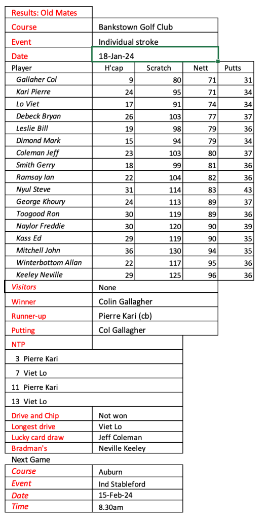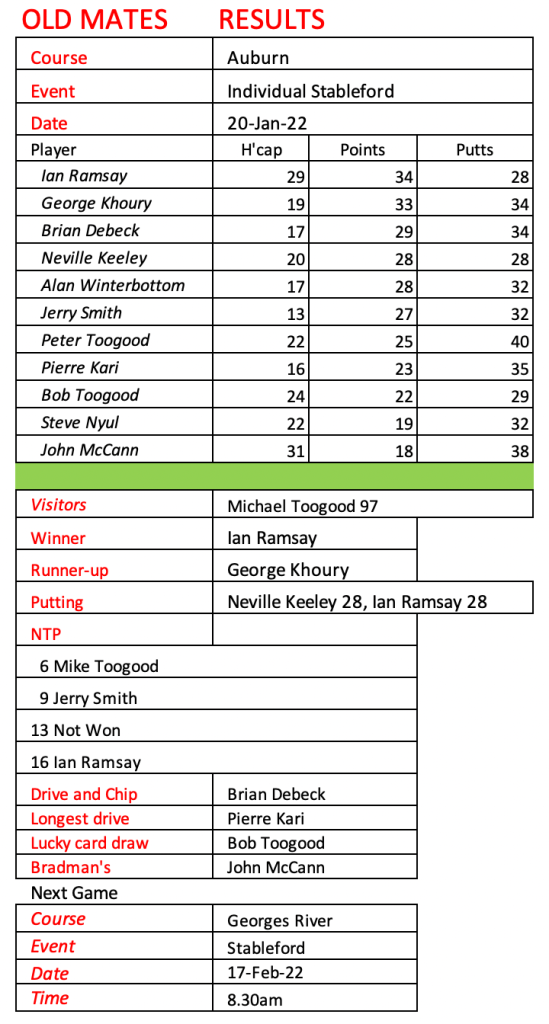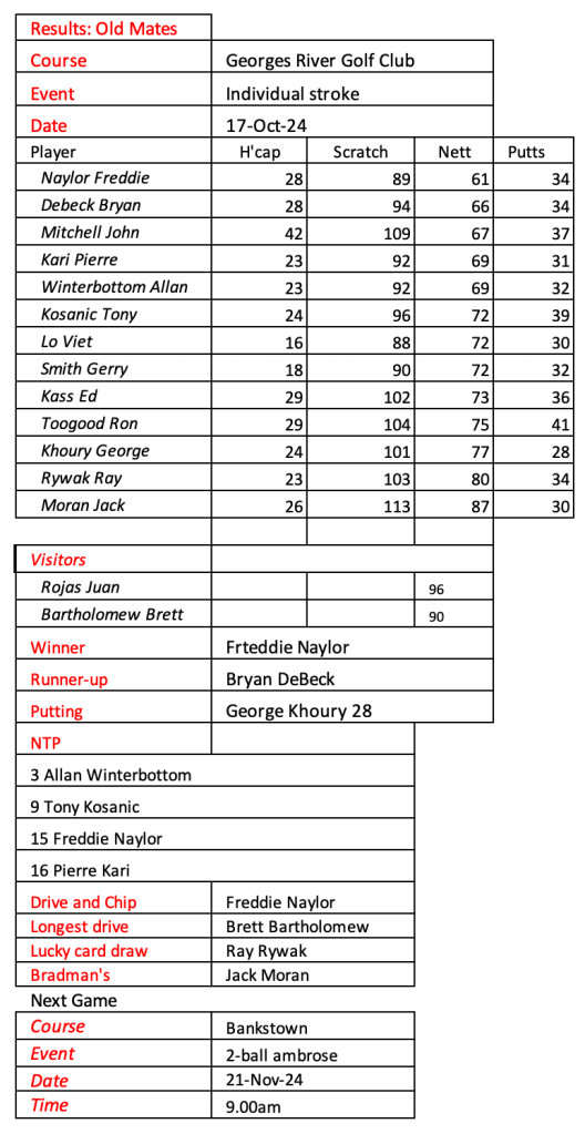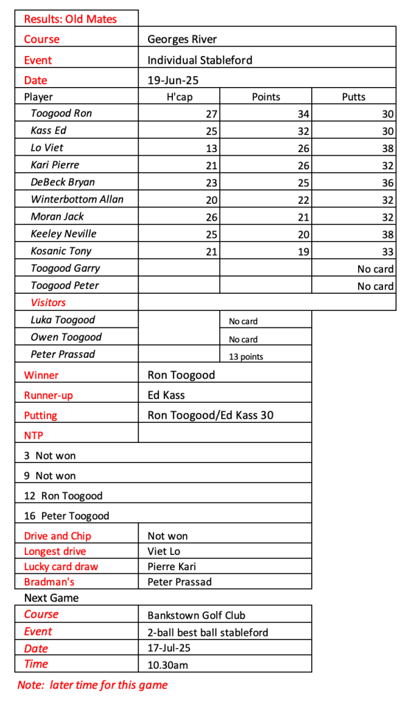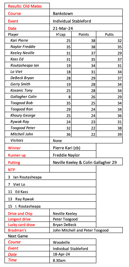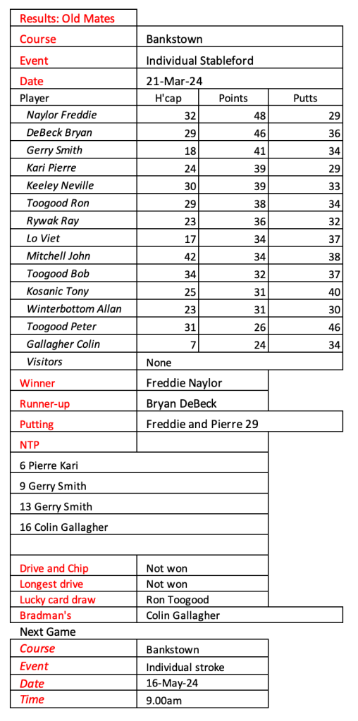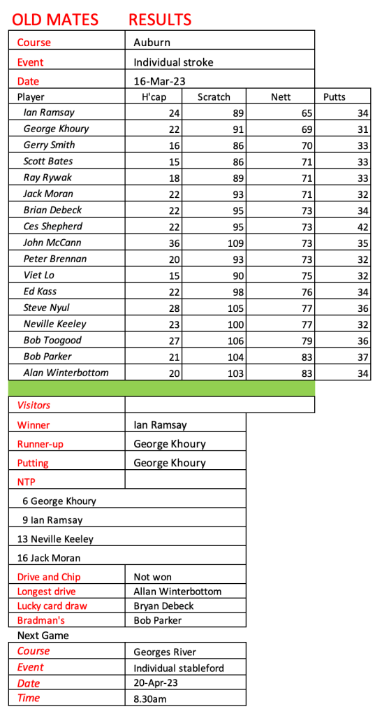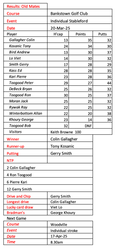 Old mates were excited to play our first game at Bankstown Golf Club today following the amalgamation of Bankstown Sports and Bankstown Golf Club. Conditions were quite tough and wet under foot. We welcomed three of our Sunday players who were still on holidays. See today’s results below.