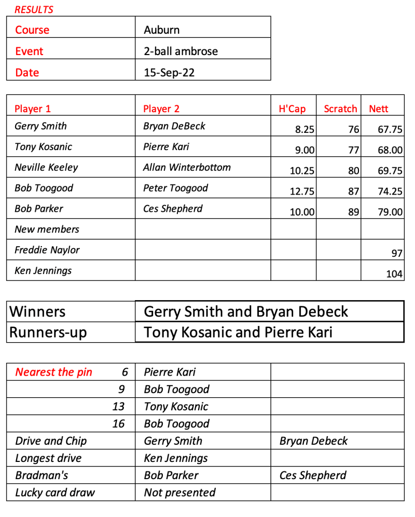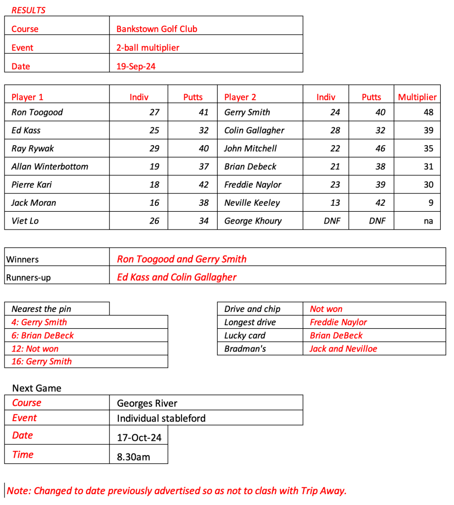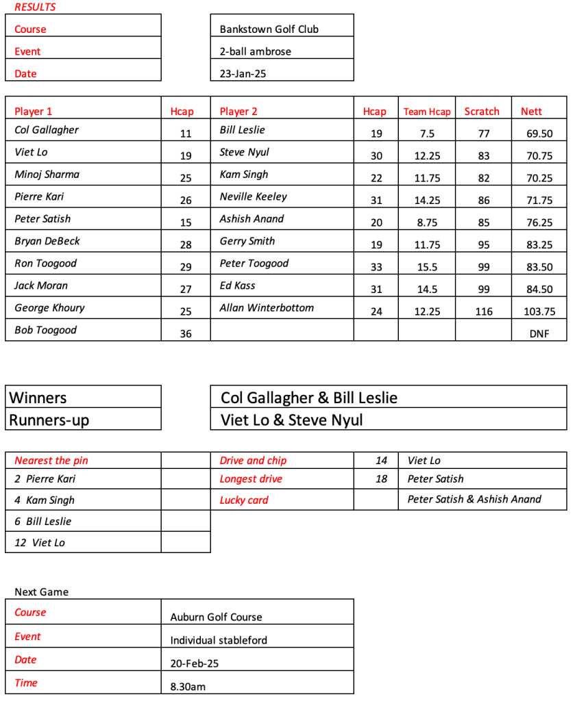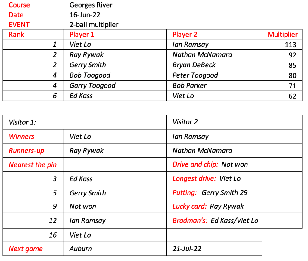 Please note the next game will be an individual stable ford event. The 2-ball ambrose, where partners are drawn out of a hat will be played at the next Bankstown game when we will all be in carts.