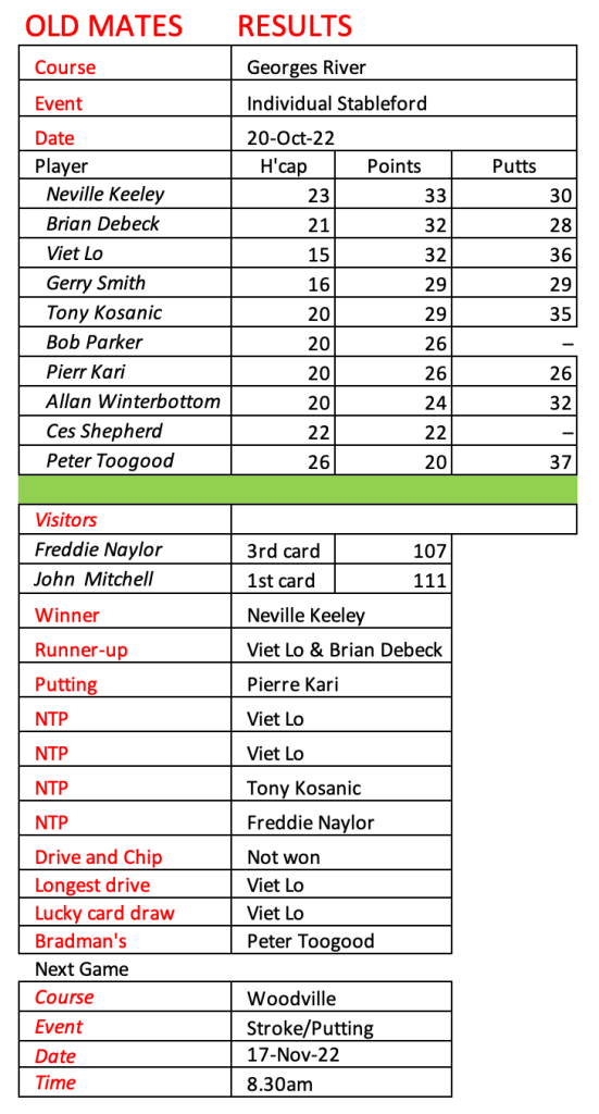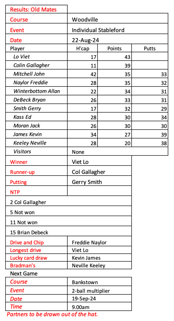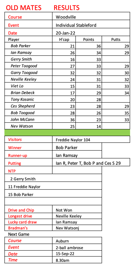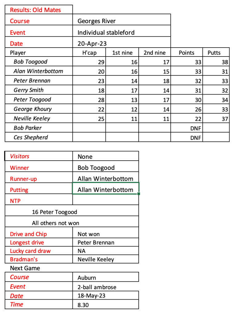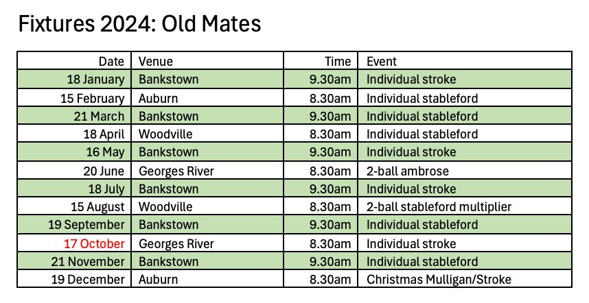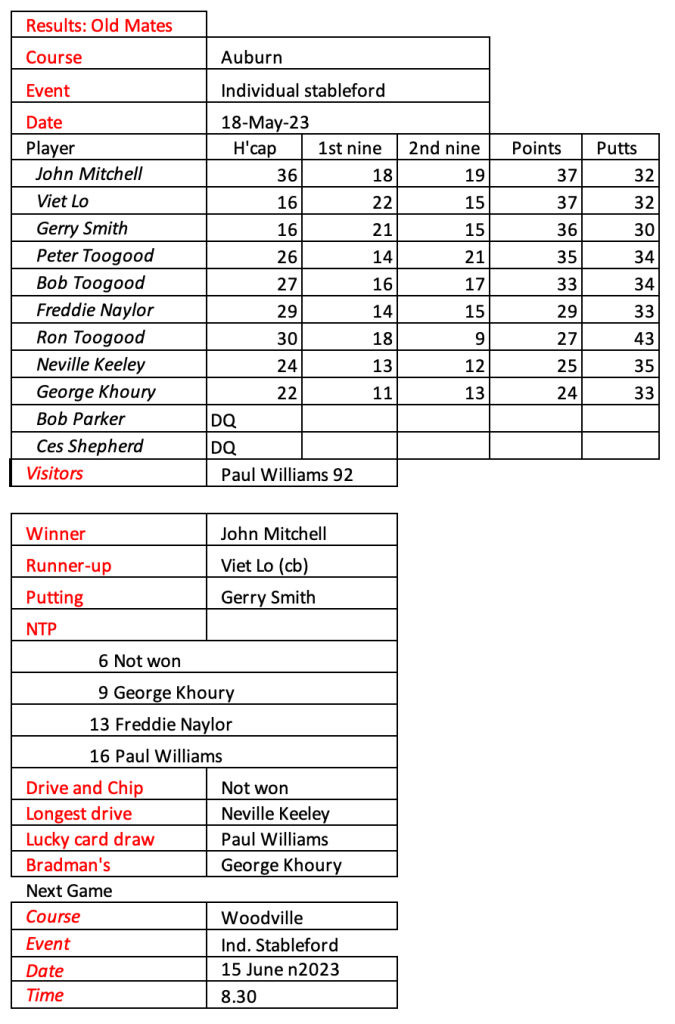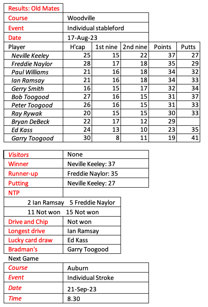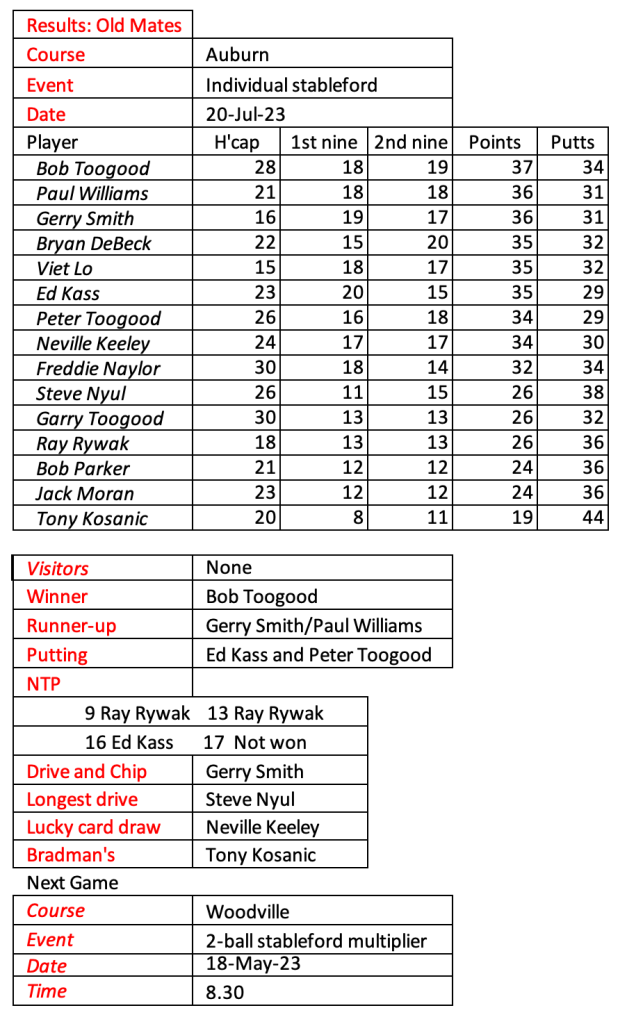 I don’t know how much more golf I will be playing so I am looking for a volunteer or two to take over the role of organising Old Mates. Happy to assist with a handover period.