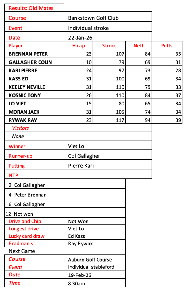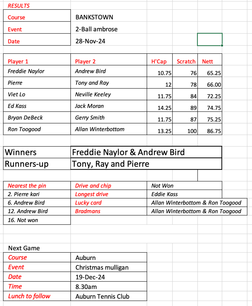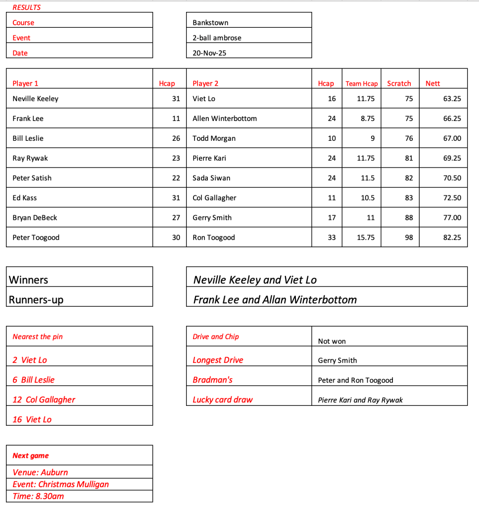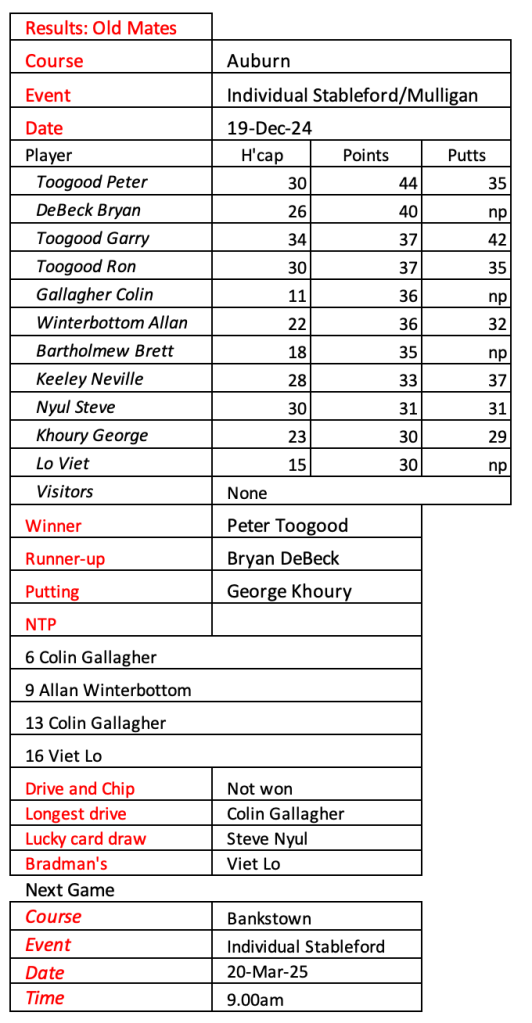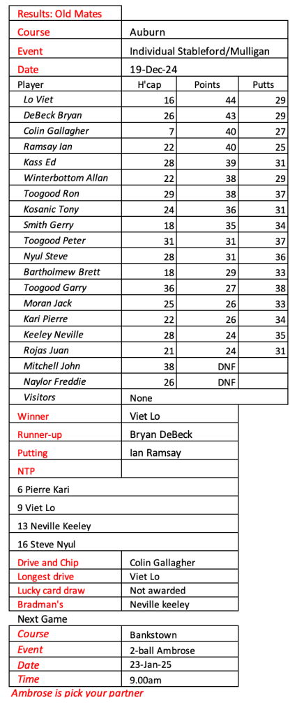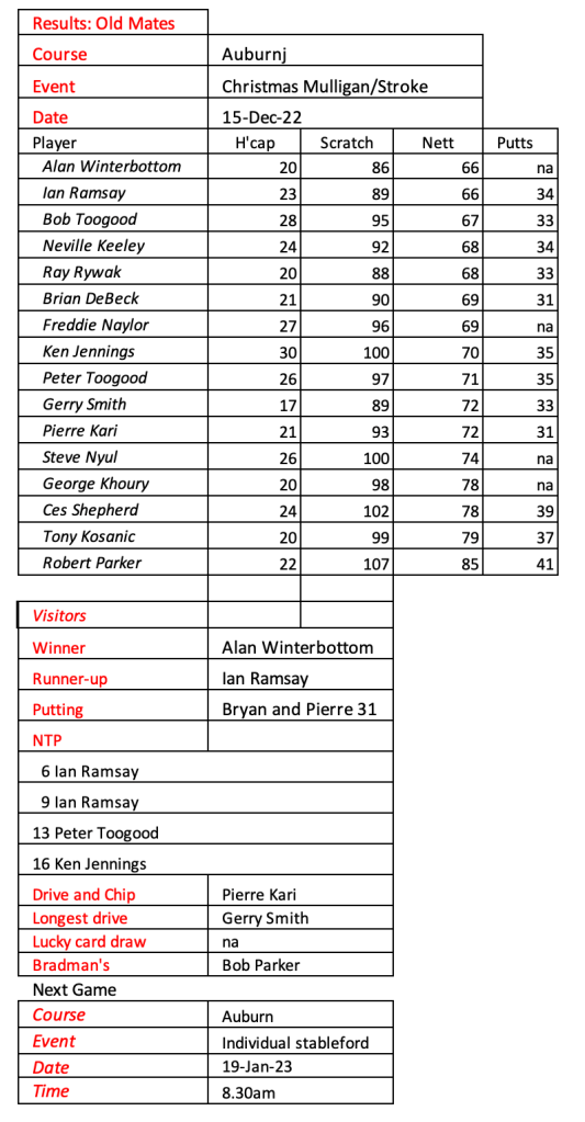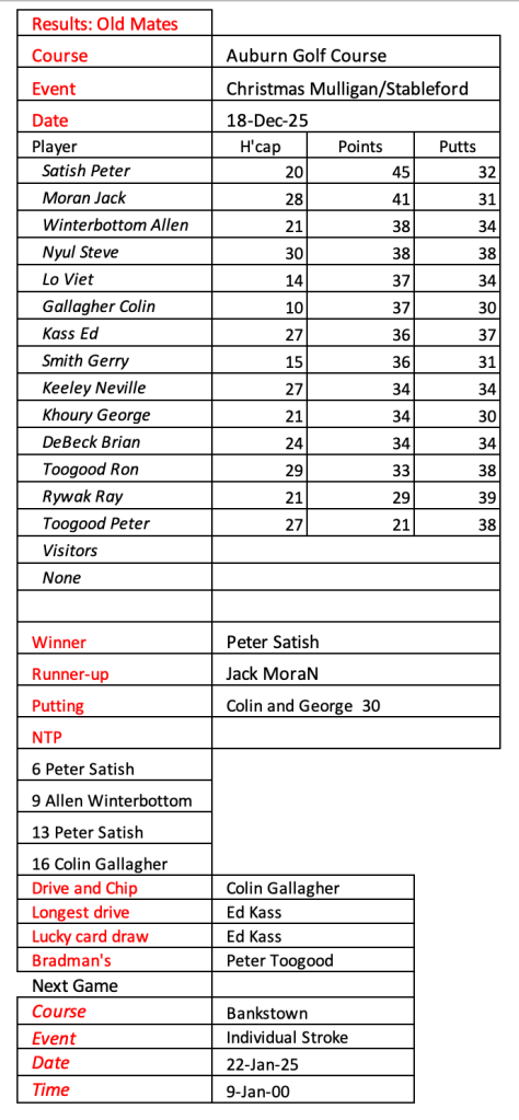 Old mates results from Auburn Christmas Mulligan. Thanks for a great year with golf played in the true spirit of SOCIAL golf. See you in 2026.