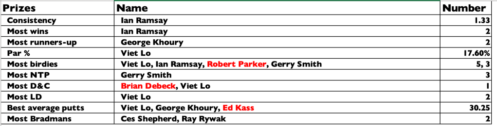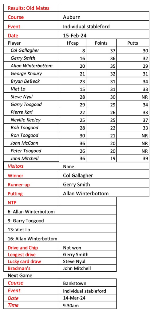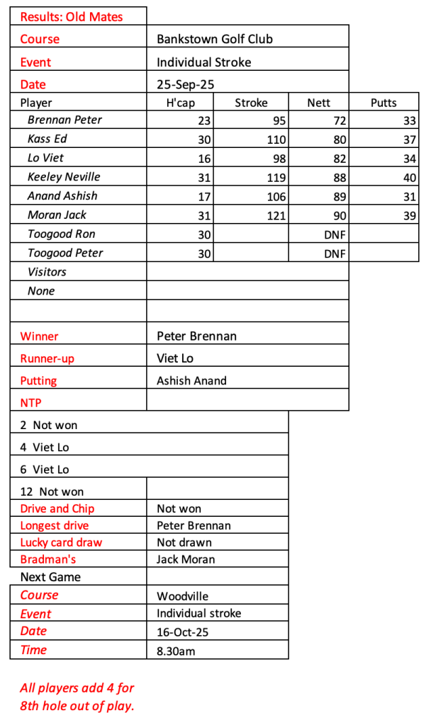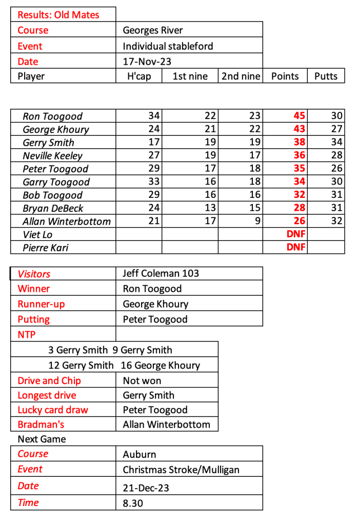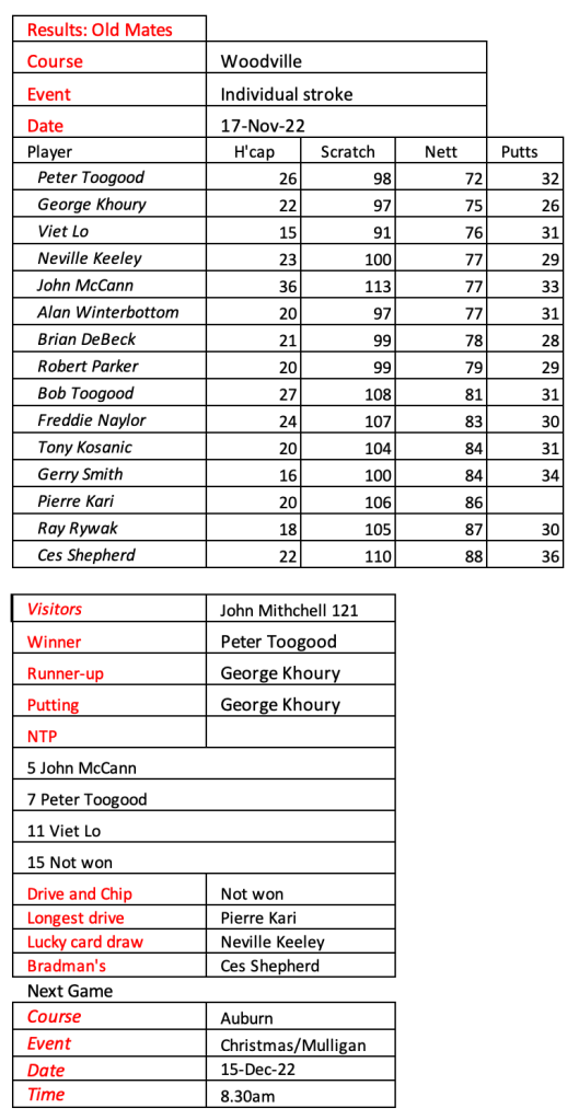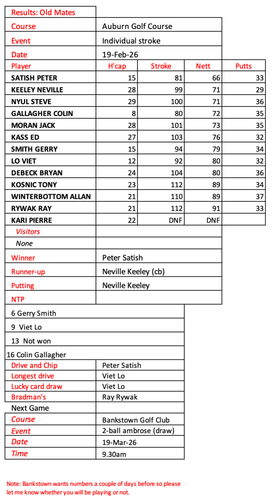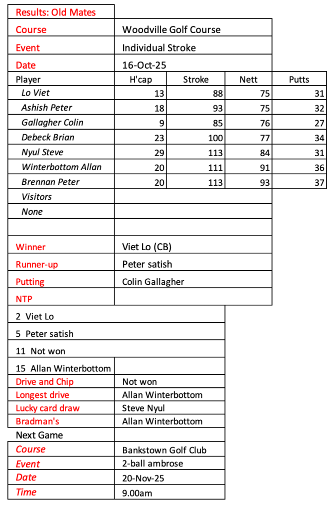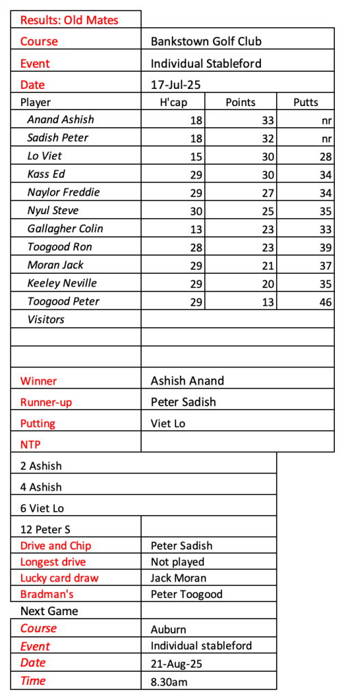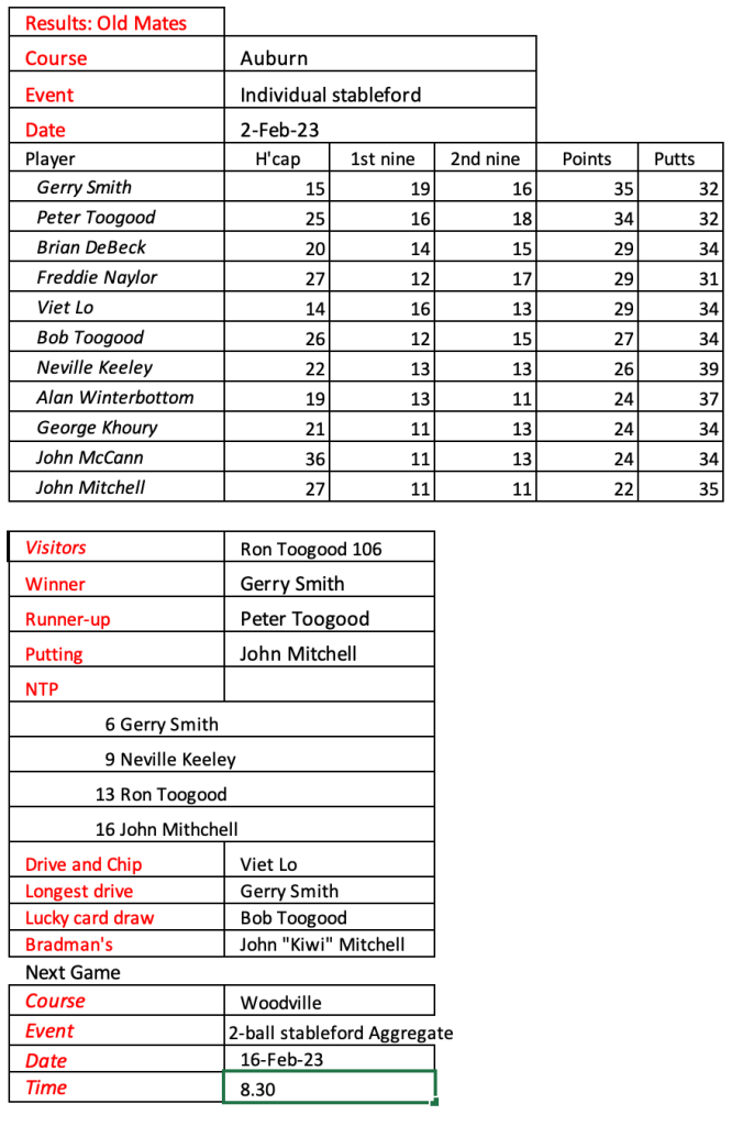 Old mates results from Auburn Christmas Mulligan. Thanks for a great year with golf played in the true spirit of SOCIAL golf. See you in 2026.