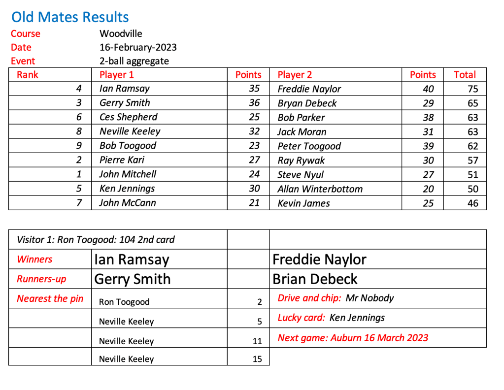 Old Mates results at Woodville 16 Feb 2023