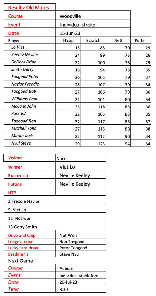 Beautiful day and course in great condition for the Old Mates game at Woodville on Thursday 15 June 2023. Congratulations to Viet on a strong win.