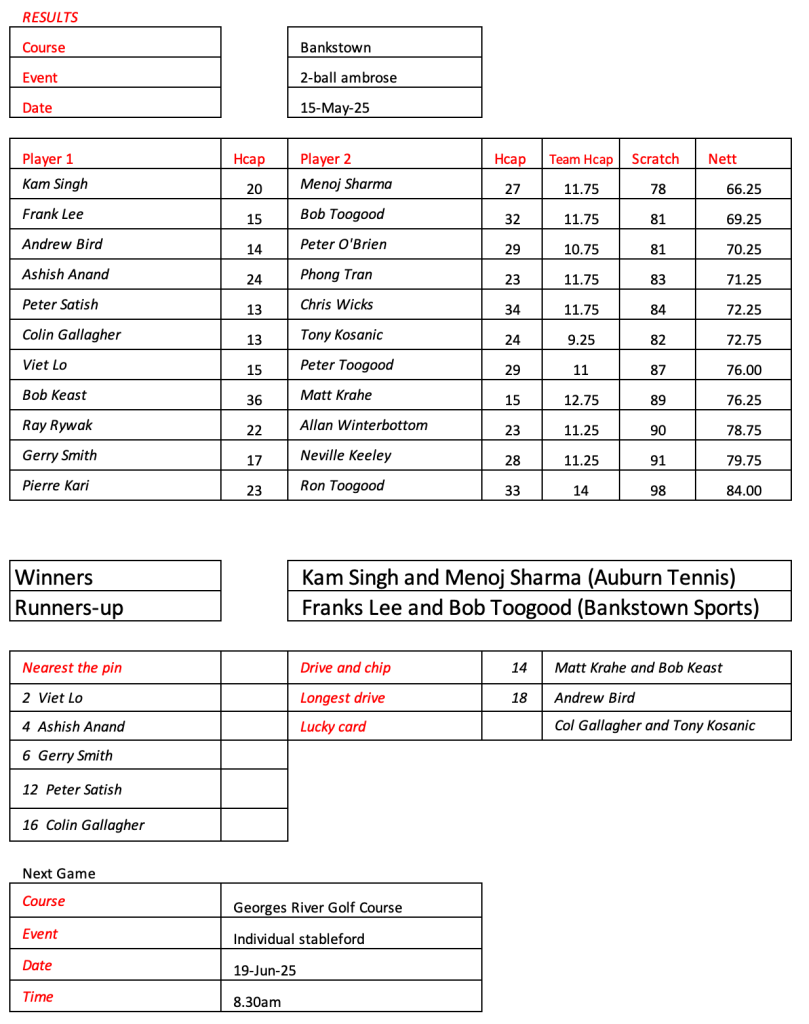 Not too many scores to be proud of today, but it was good to see Peter Prassad make a guest appearance. Note the next game at Bankstown tees off at 10.30am.