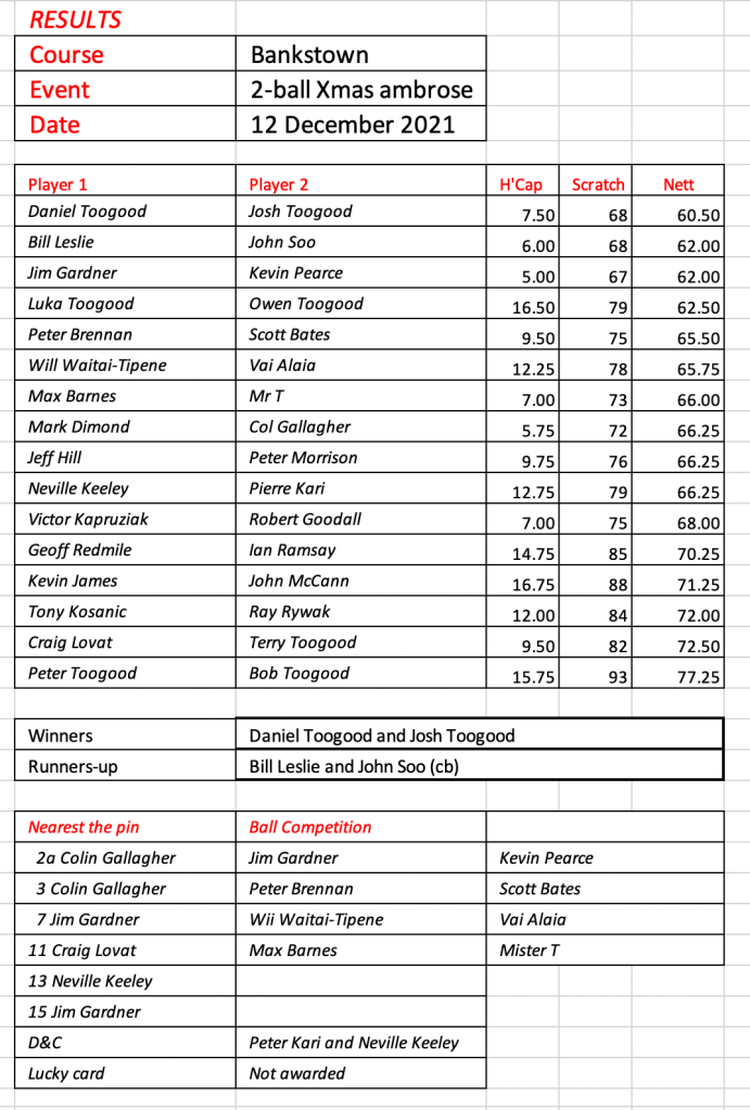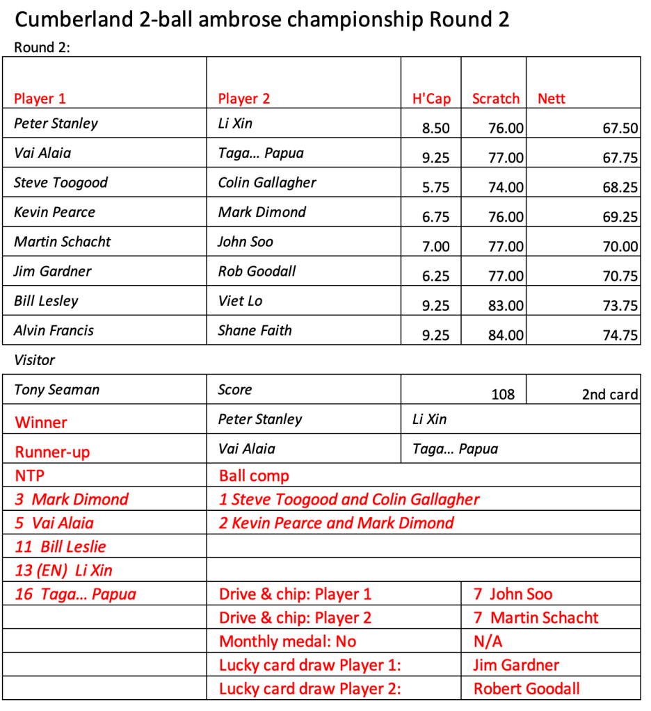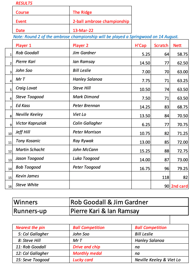 As a result the winners of the Ambrose Club Championships are Mark Dimond and Kevin Pearce, congratulations to you both.