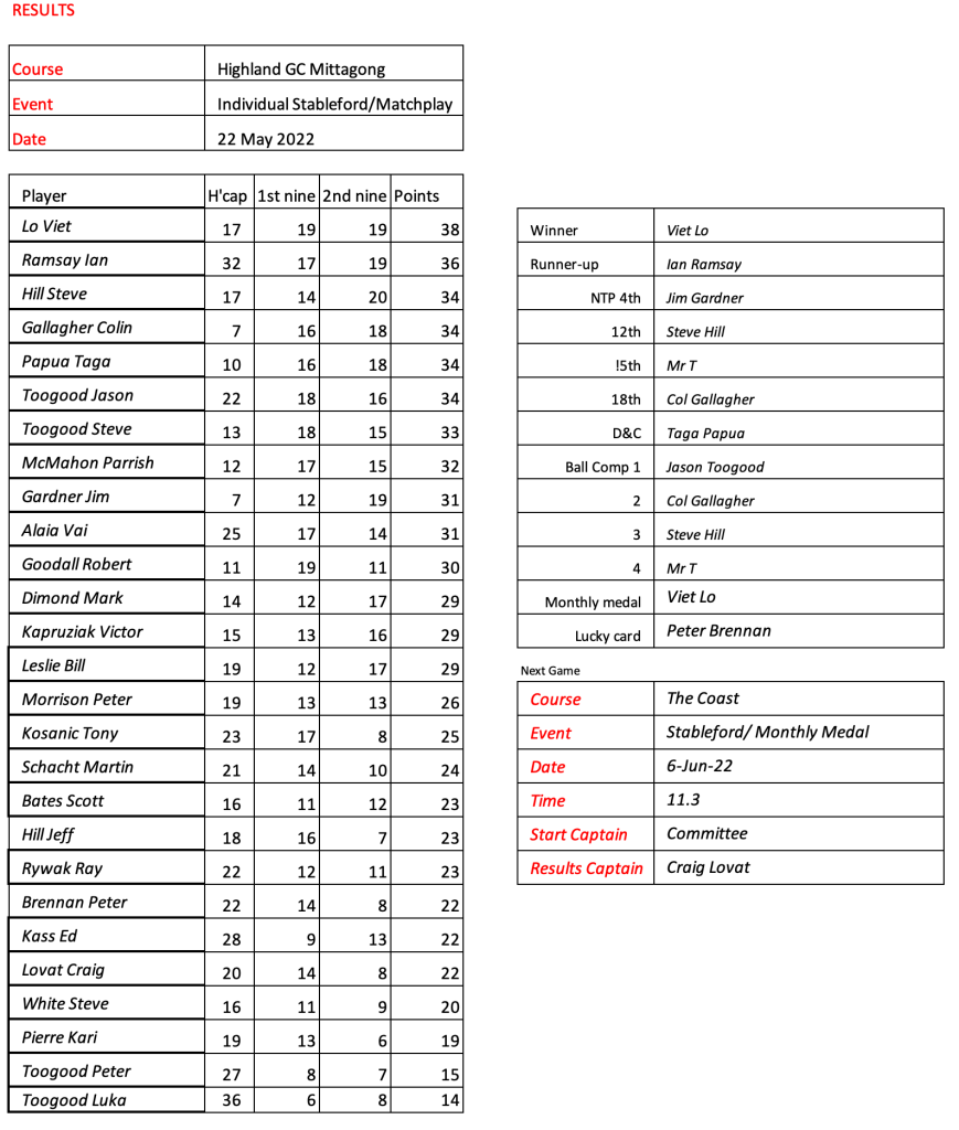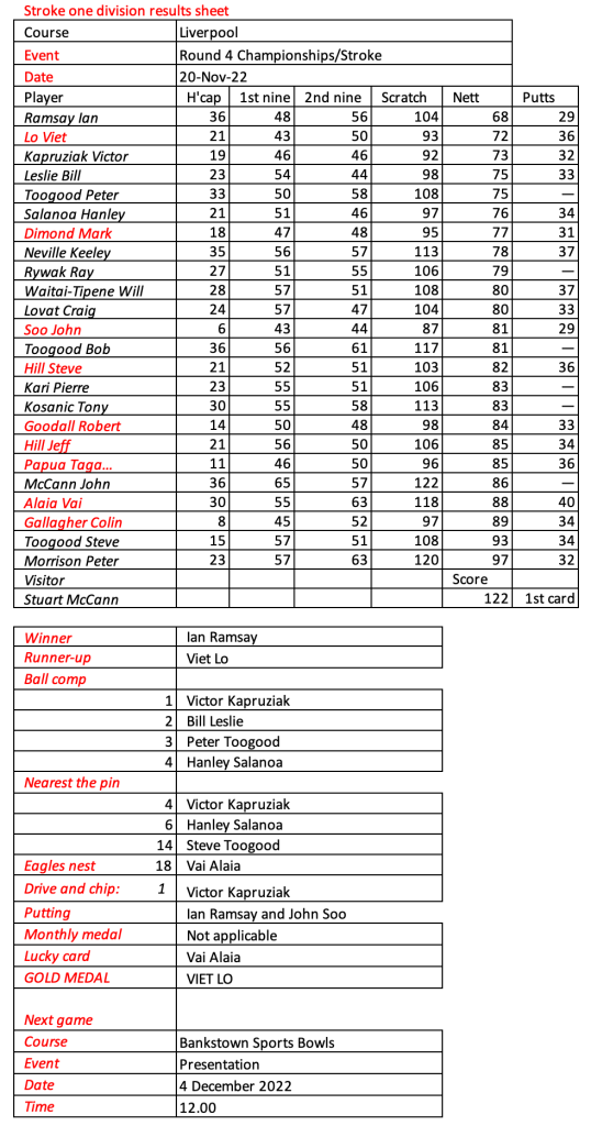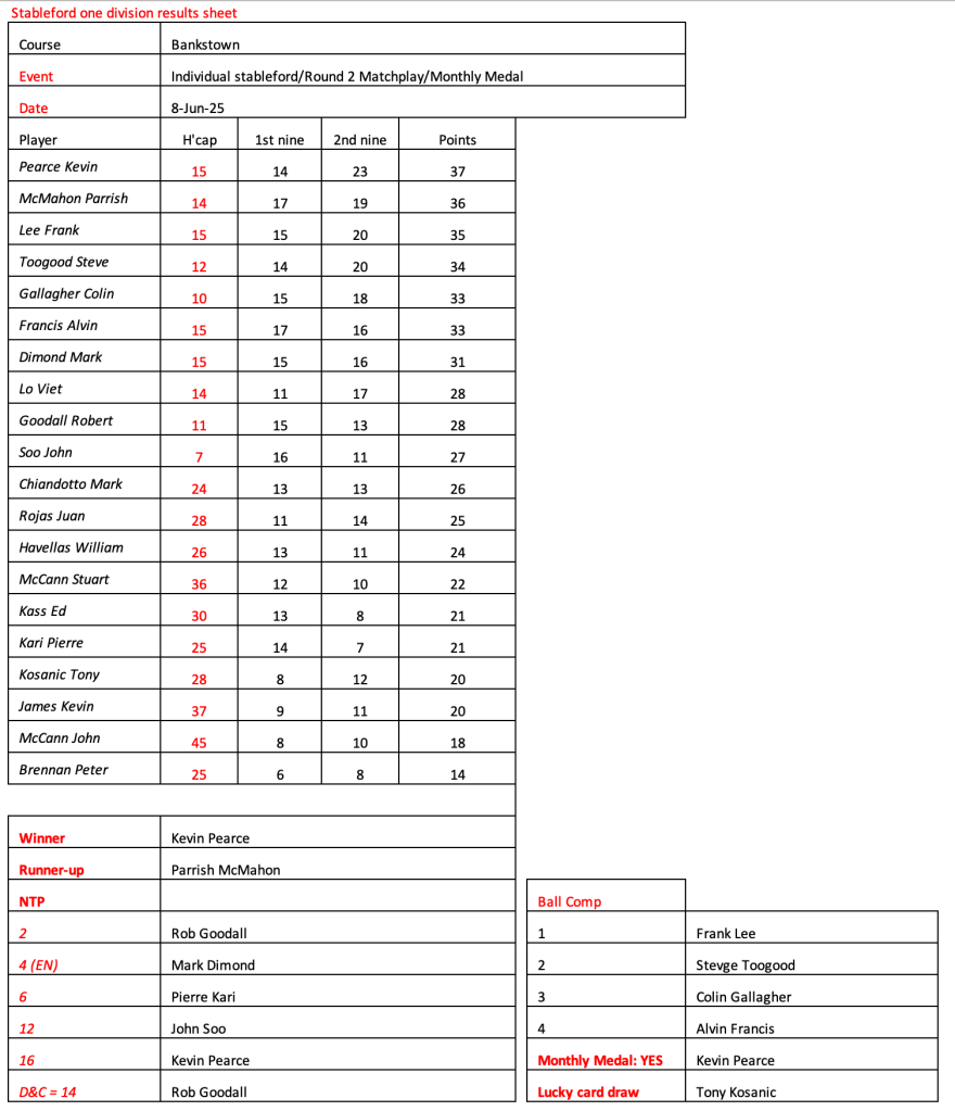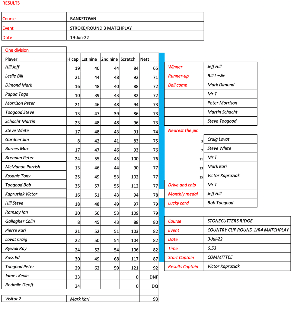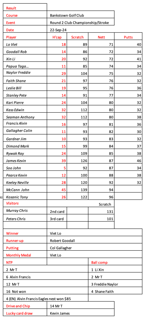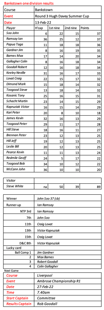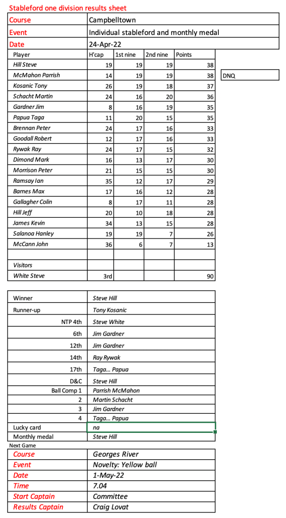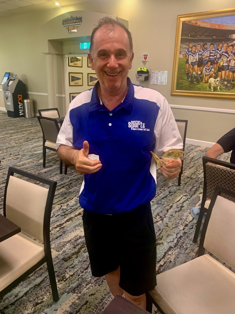 Some very good scores after a pleasant day had by all at the revamped Hurstville Course, our President, Kevin couldn’t stop smiling. Well done on your win!