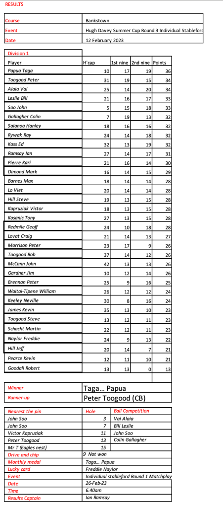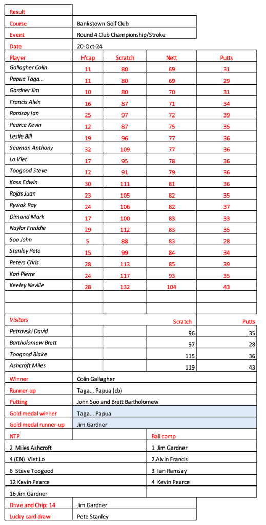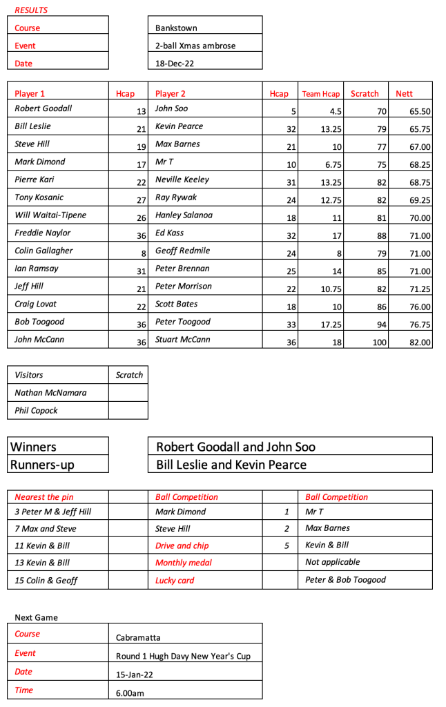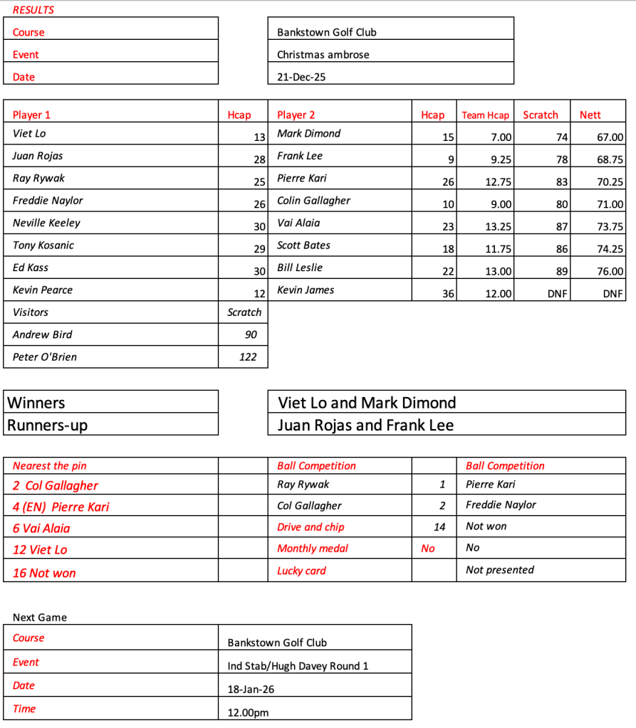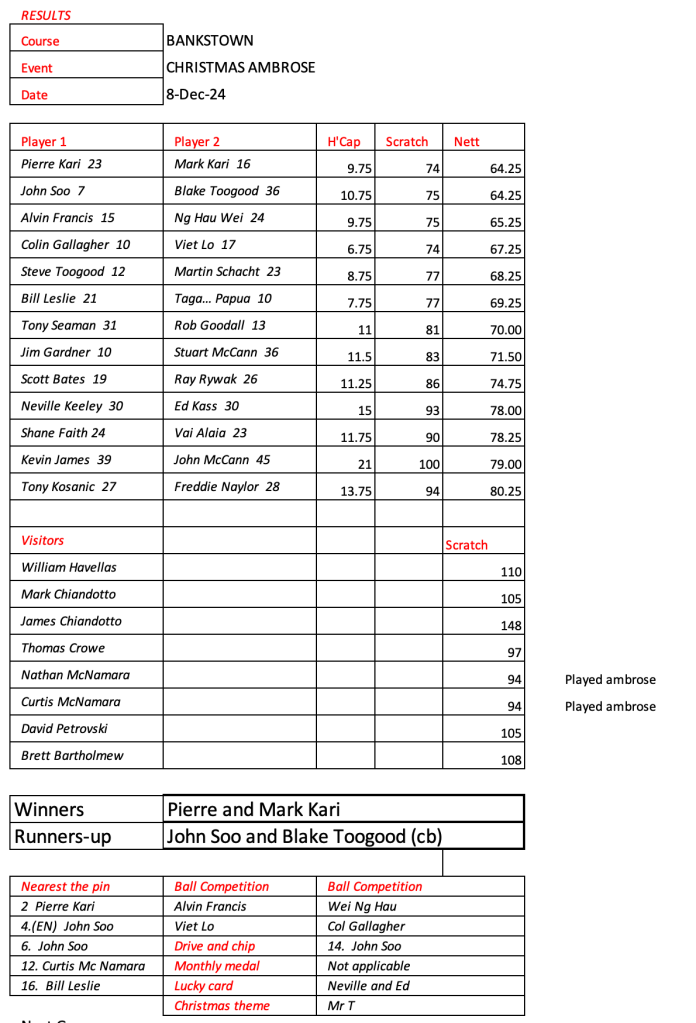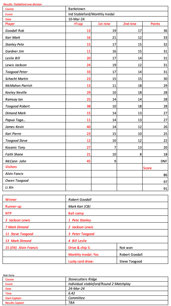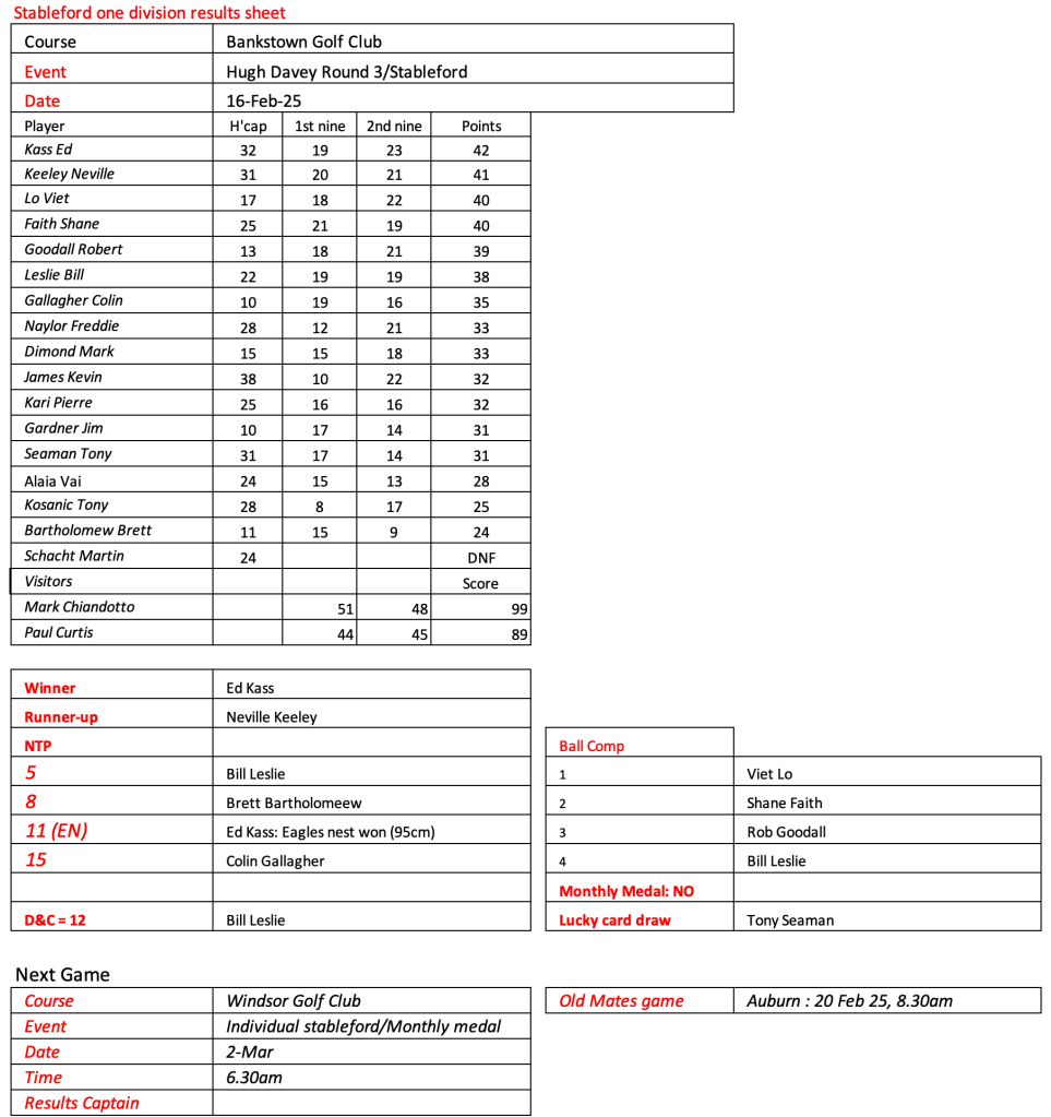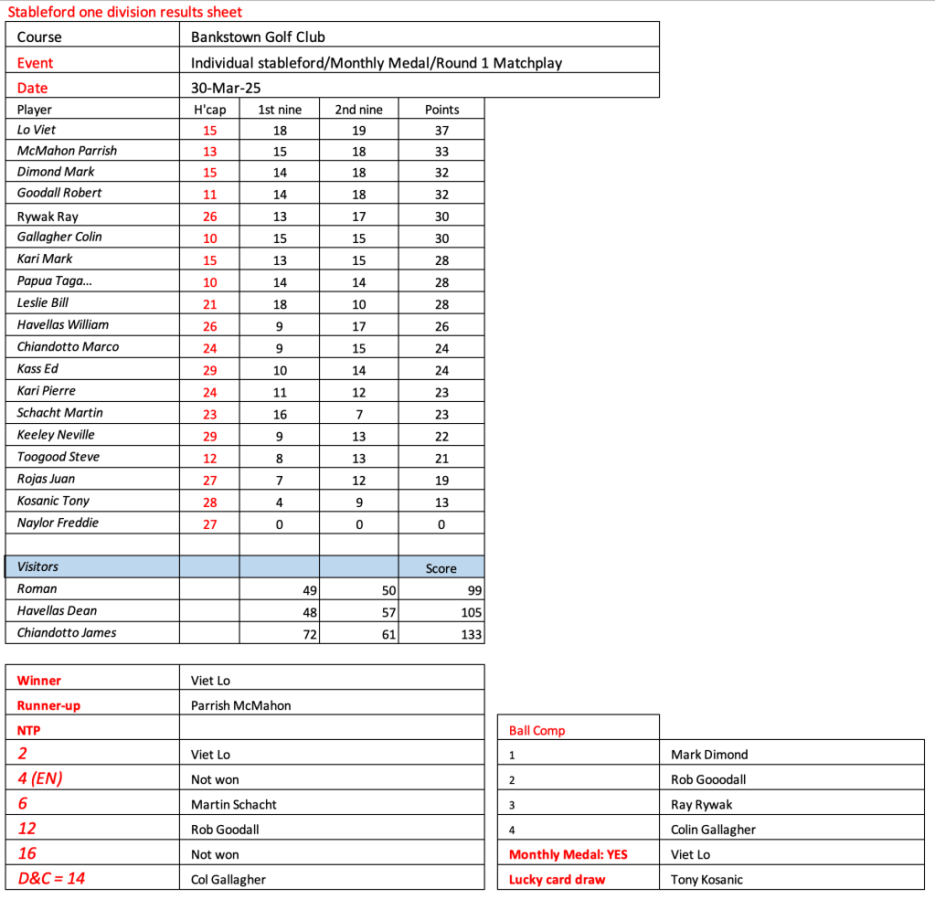 Some very good scores after a pleasant day had by all at the revamped Hurstville Course, our President, Kevin couldn’t stop smiling. Well done on your win!