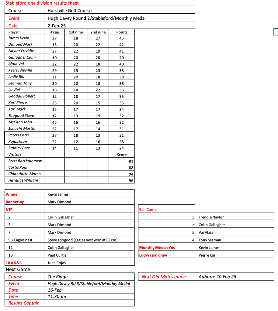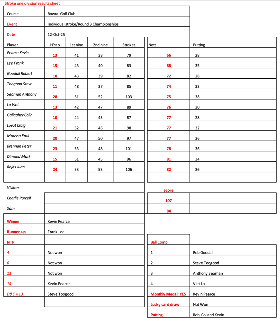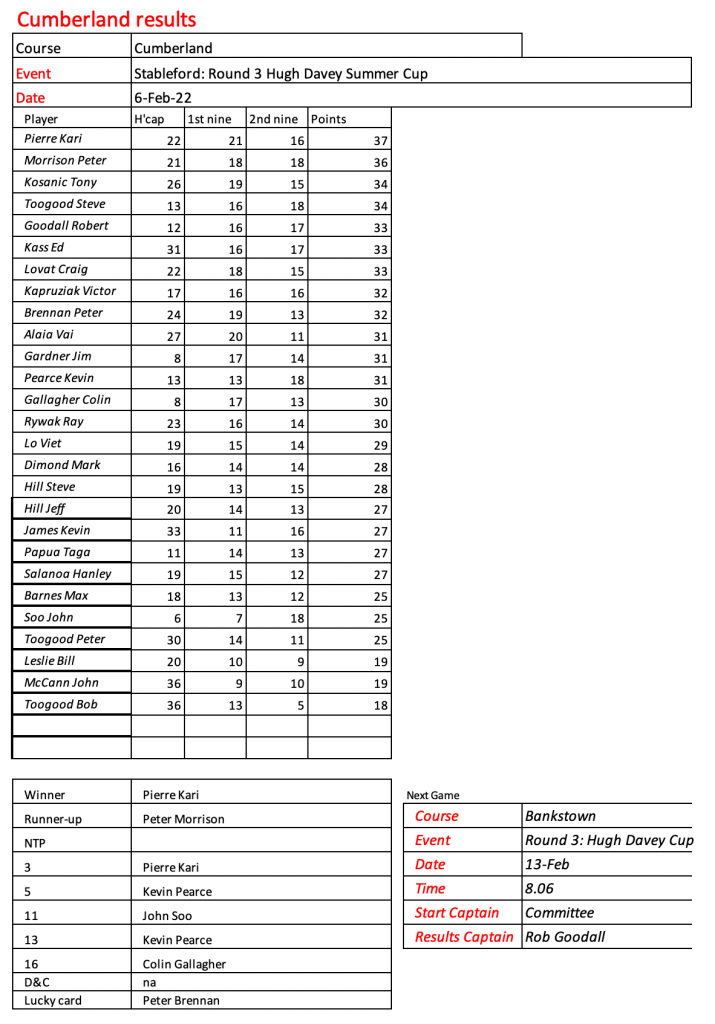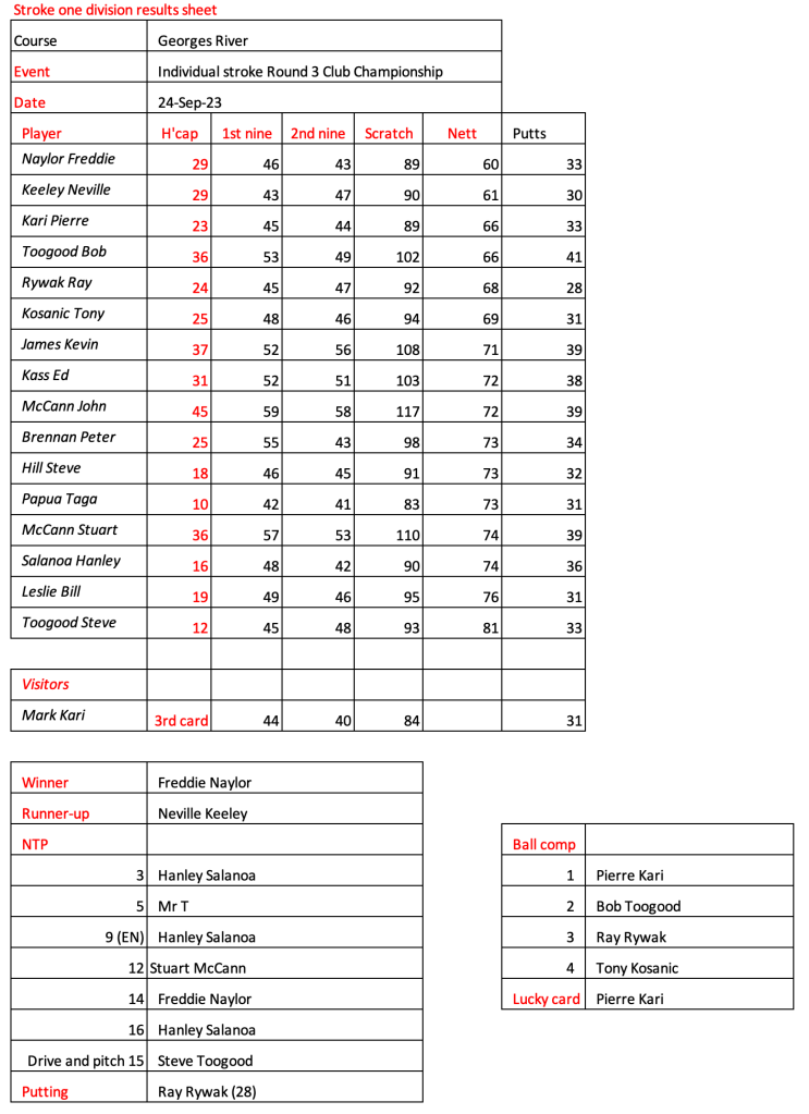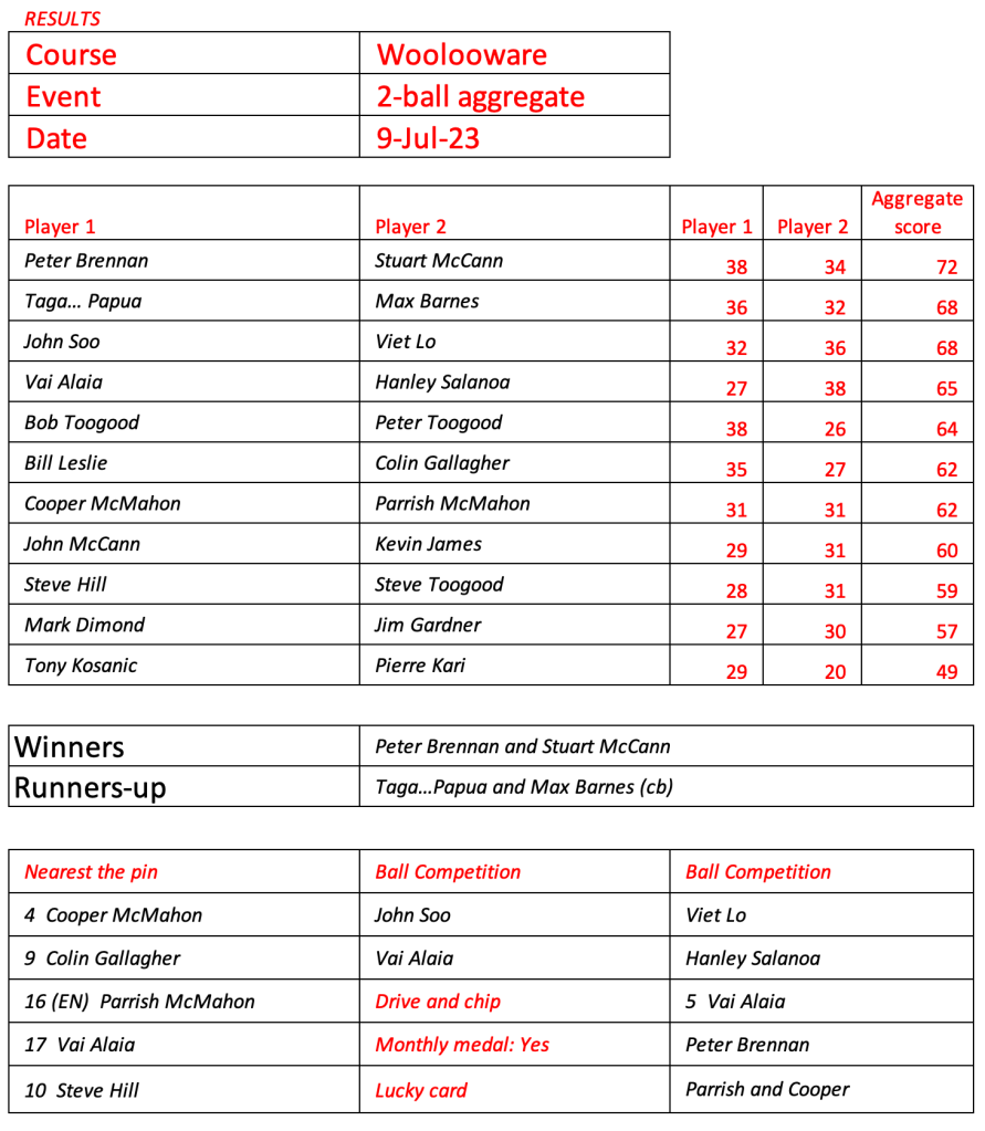 Looks like Kevin has recovered from his injury, well done. Great to see the return of Peter Brennan, Frank Lee, Craig Lovat and Jason Toogood. Scores indicate it was pretty tough going today.