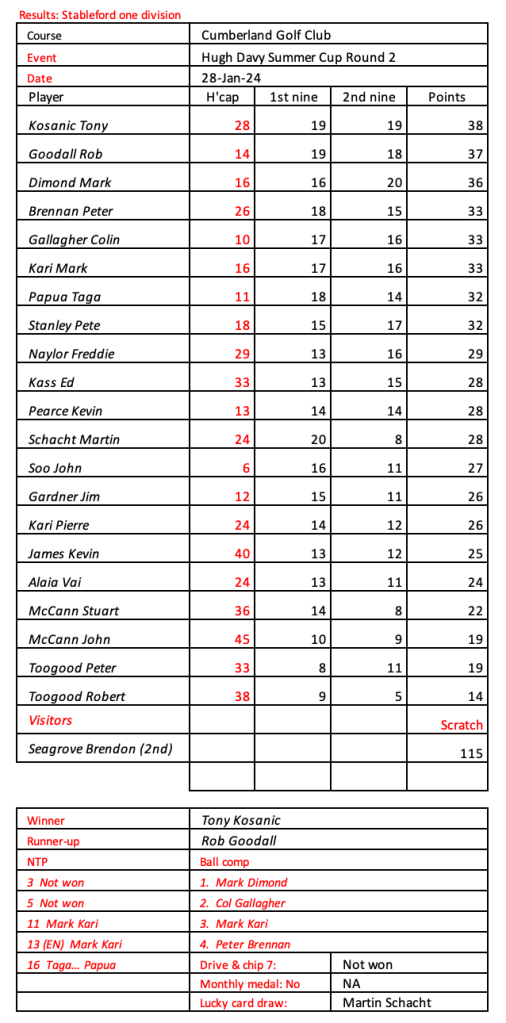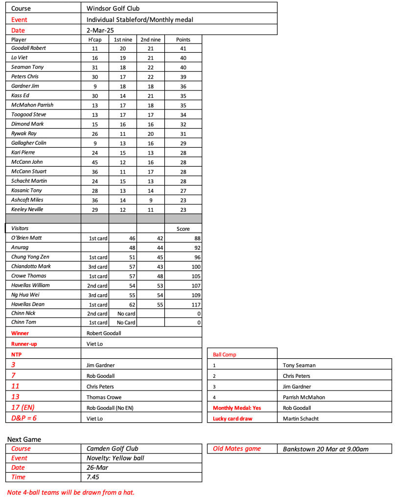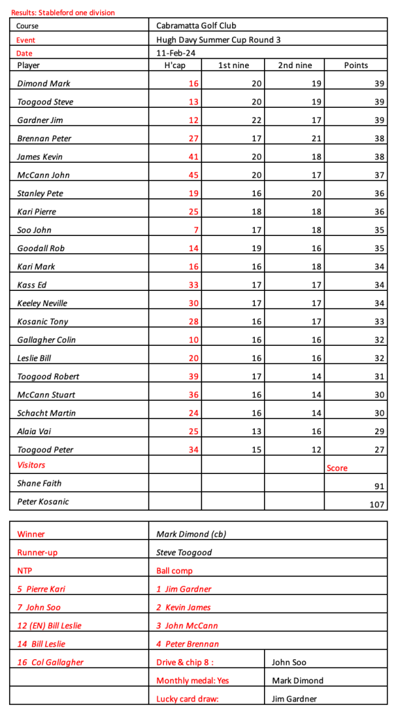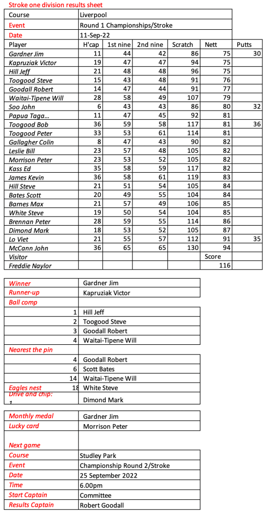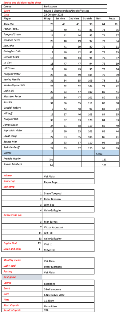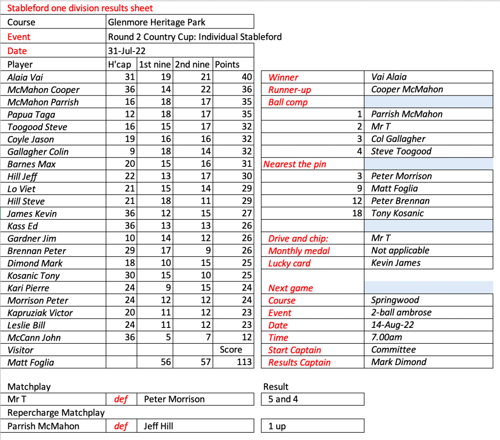 Looks like Kevin has recovered from his injury, well done. Great to see the return of Peter Brennan, Frank Lee, Craig Lovat and Jason Toogood. Scores indicate it was pretty tough going today.
