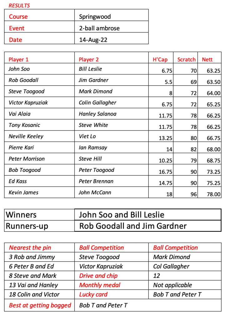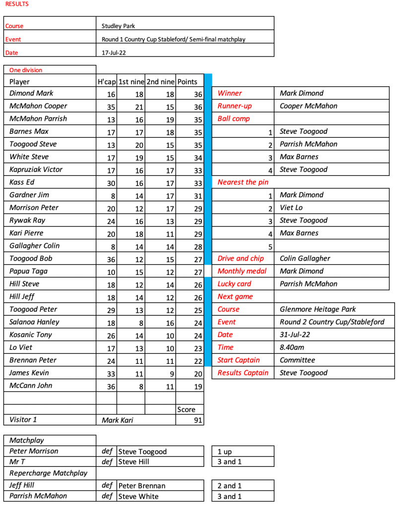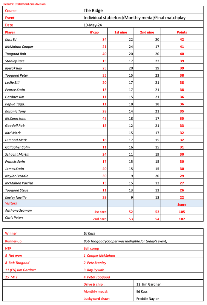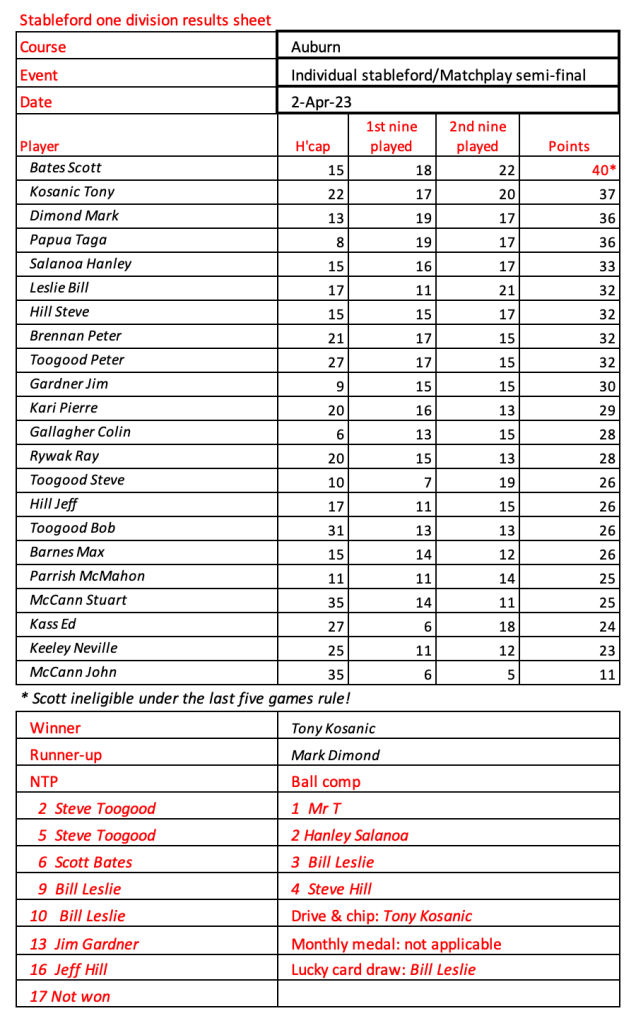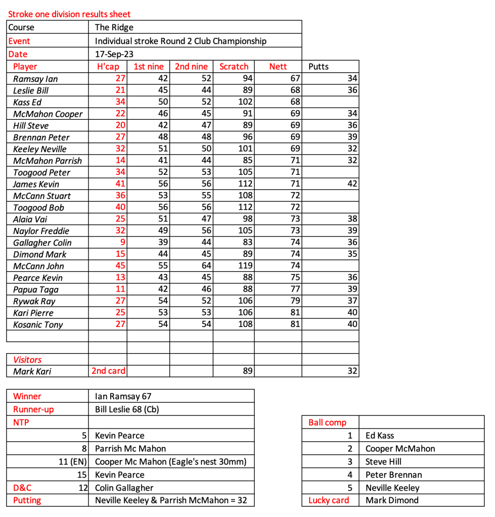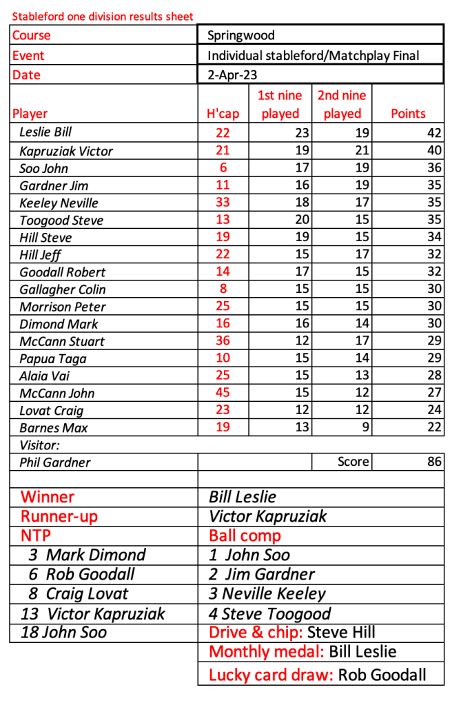 Today’s stableford event was played in wet conditions that seemed to suit the former Kiwi, Bill Leslie. Congratulations to Steve Hill on his win in the matchplay final.