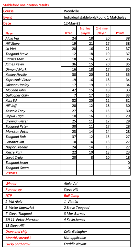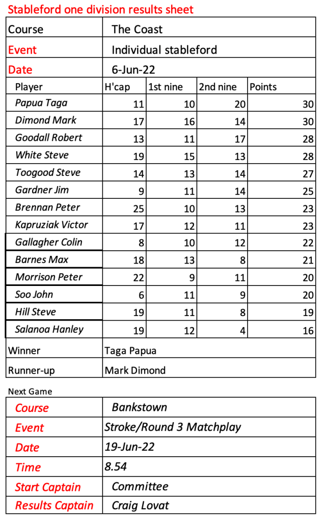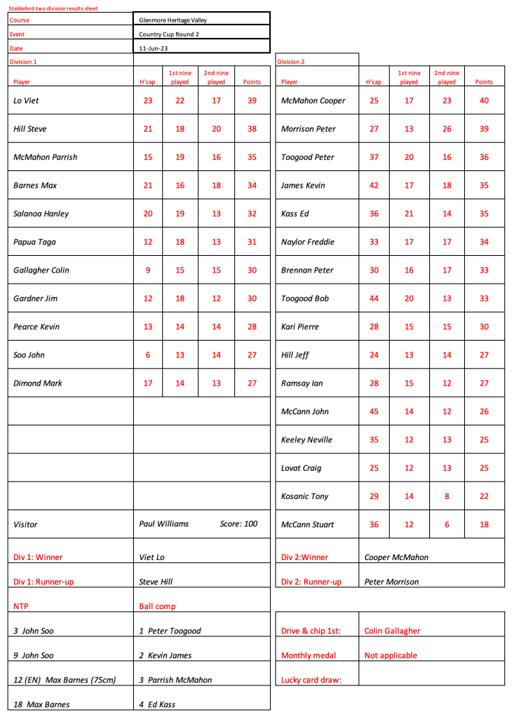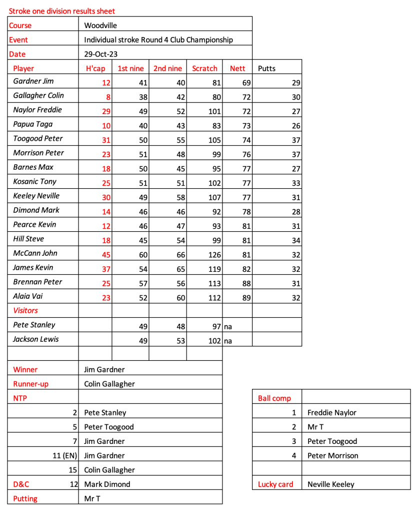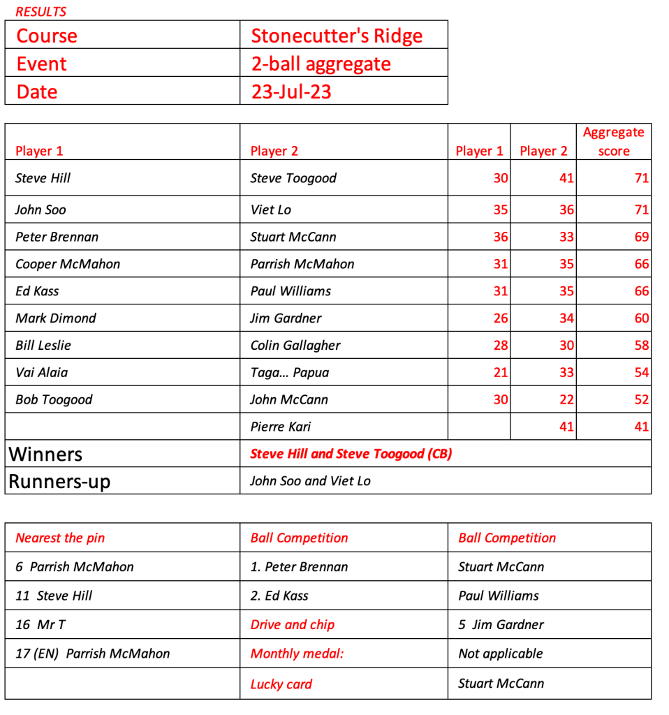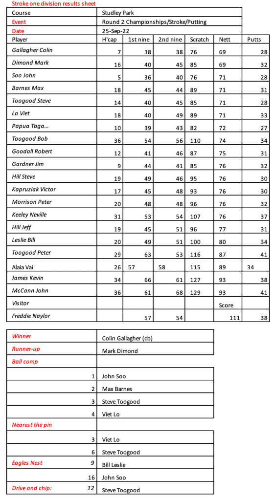 Today’s stableford event was played in wet conditions that seemed to suit the former Kiwi, Bill Leslie. Congratulations to Steve Hill on his win in the matchplay final.