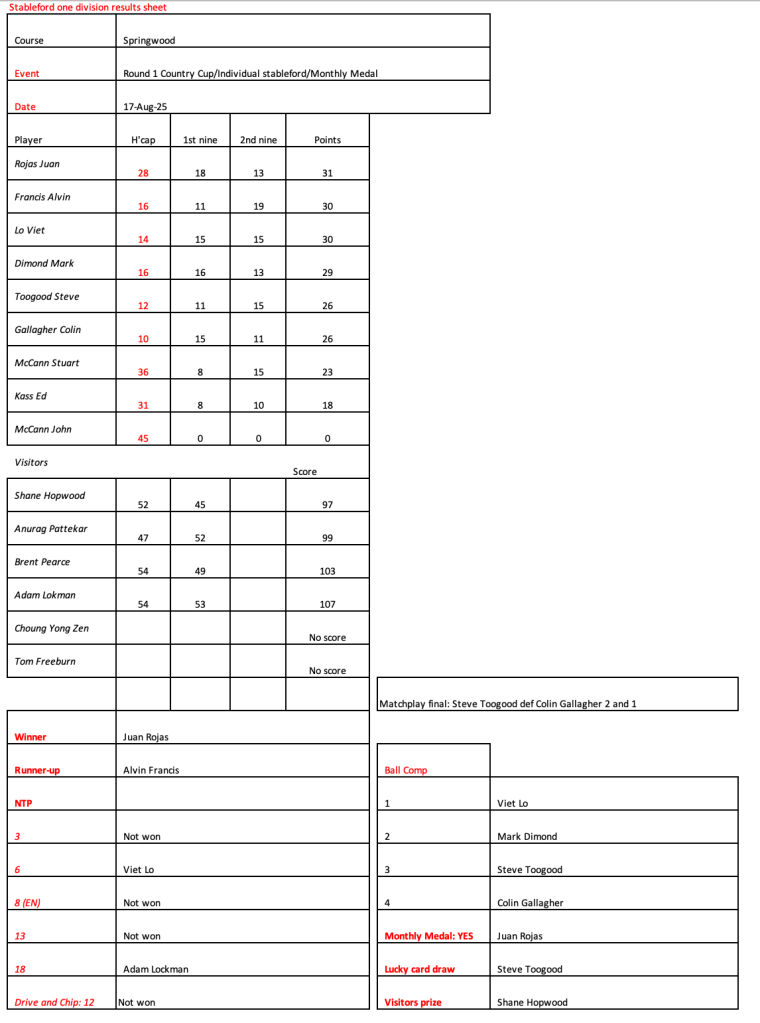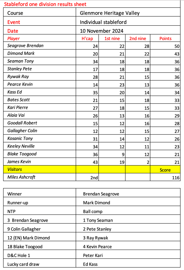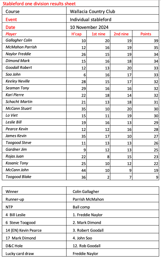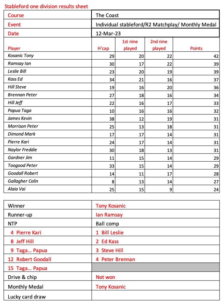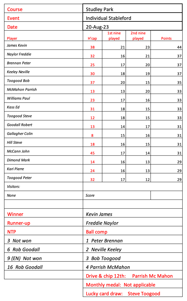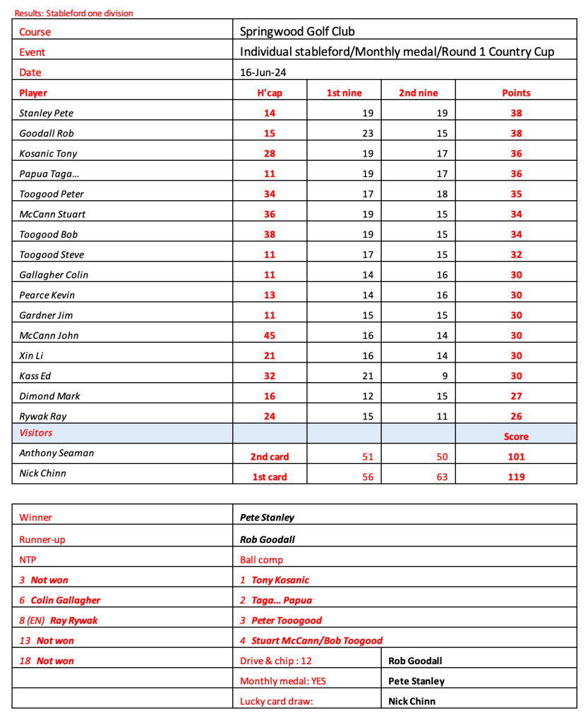 Today’s stableford event was played in wet conditions that seemed to suit the former Kiwi, Bill Leslie. Congratulations to Steve Hill on his win in the matchplay final.
