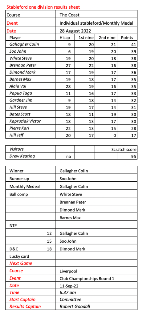 These results have been checked by Mark as it seems some members didn’t know that when there are multiple indexes shown on a card you must use the index of the tees you play from. We played the blue tees yesterday and therefore the blue index should have been applied. Please remember for next time.
