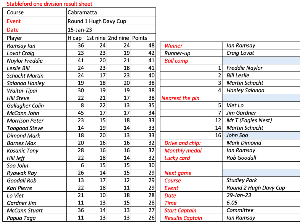 Cabramatta Results Sheet: Looks like they have been practising over the Christmas break, some very good scores at Cabramatta.