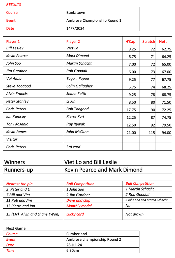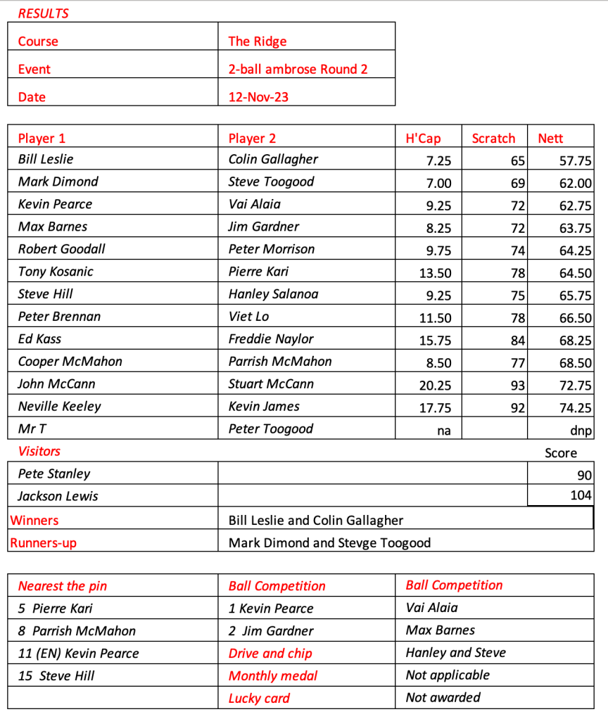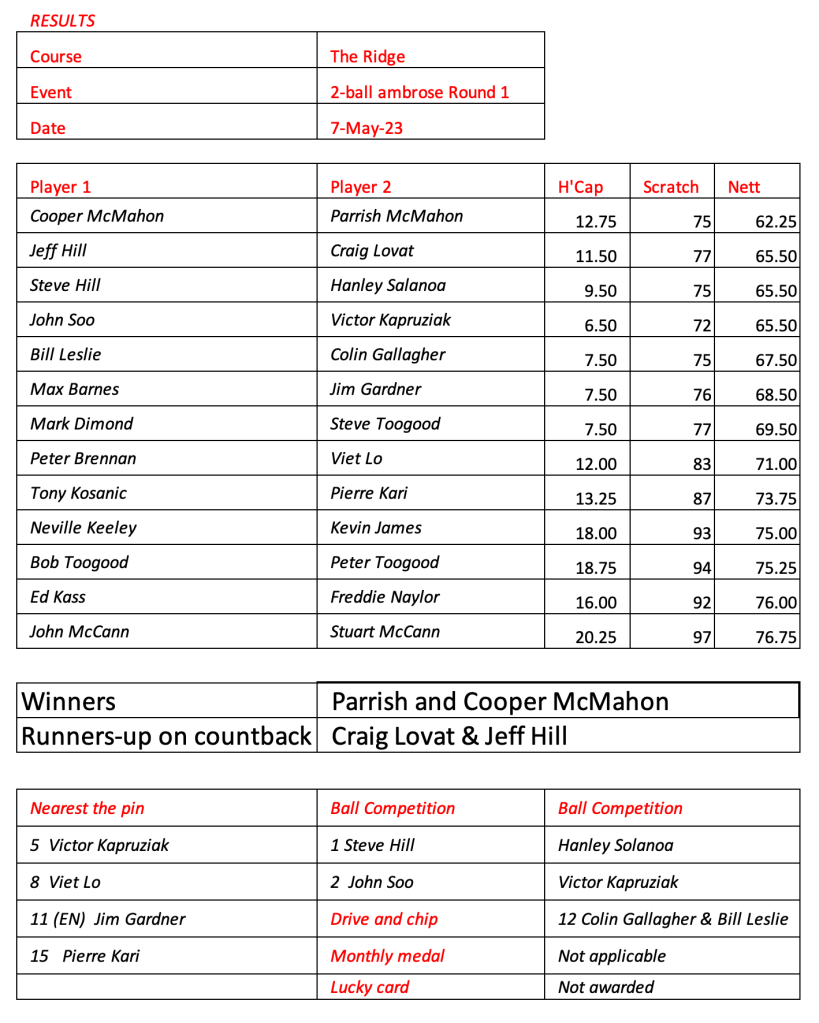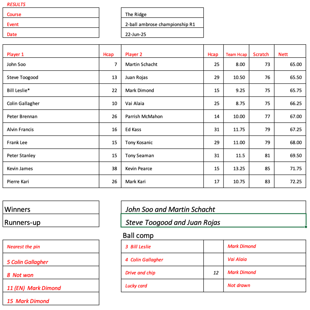 Round 1 of the ambrose championship results. Martin and John leading the way.