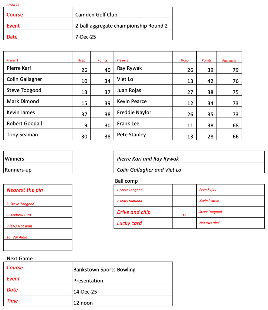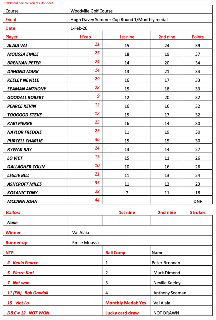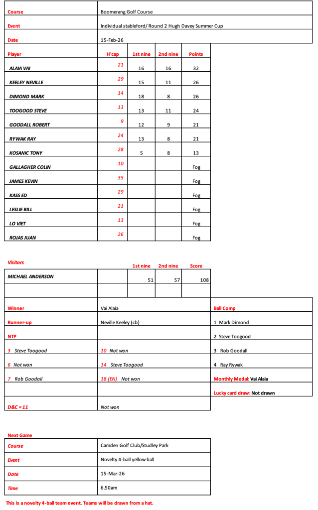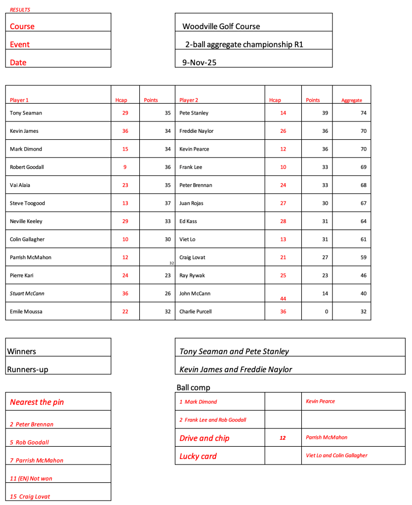 Just 12 brave souls at Fox Hills today as a result of the cart ban and persistent rain. Great to see Craig and Jason out for a game. Lots of unknowns on the start sheet for Woodville, let me know if you intend to play or not and whether you need a cart.