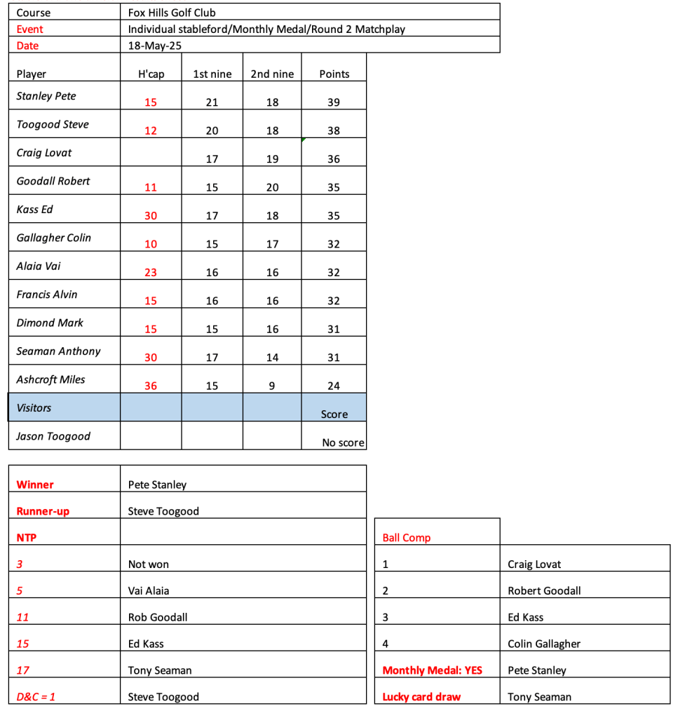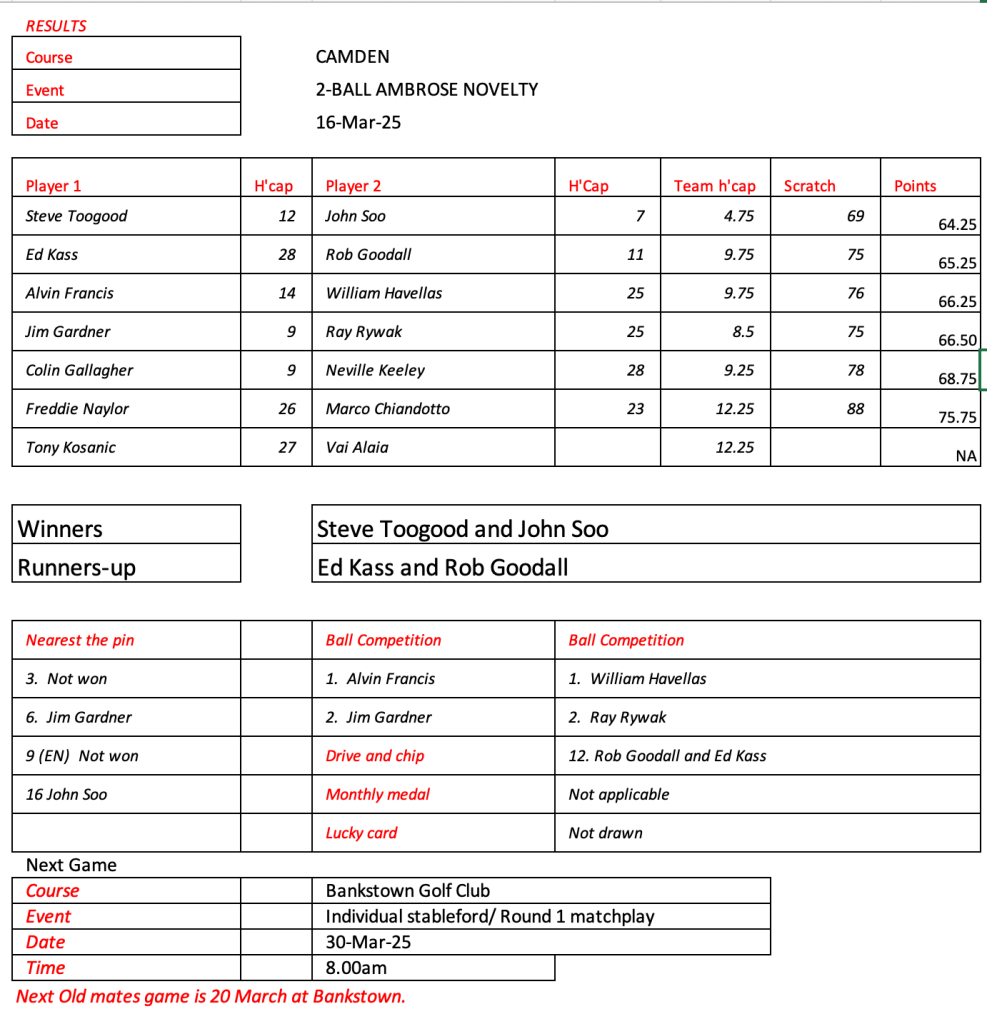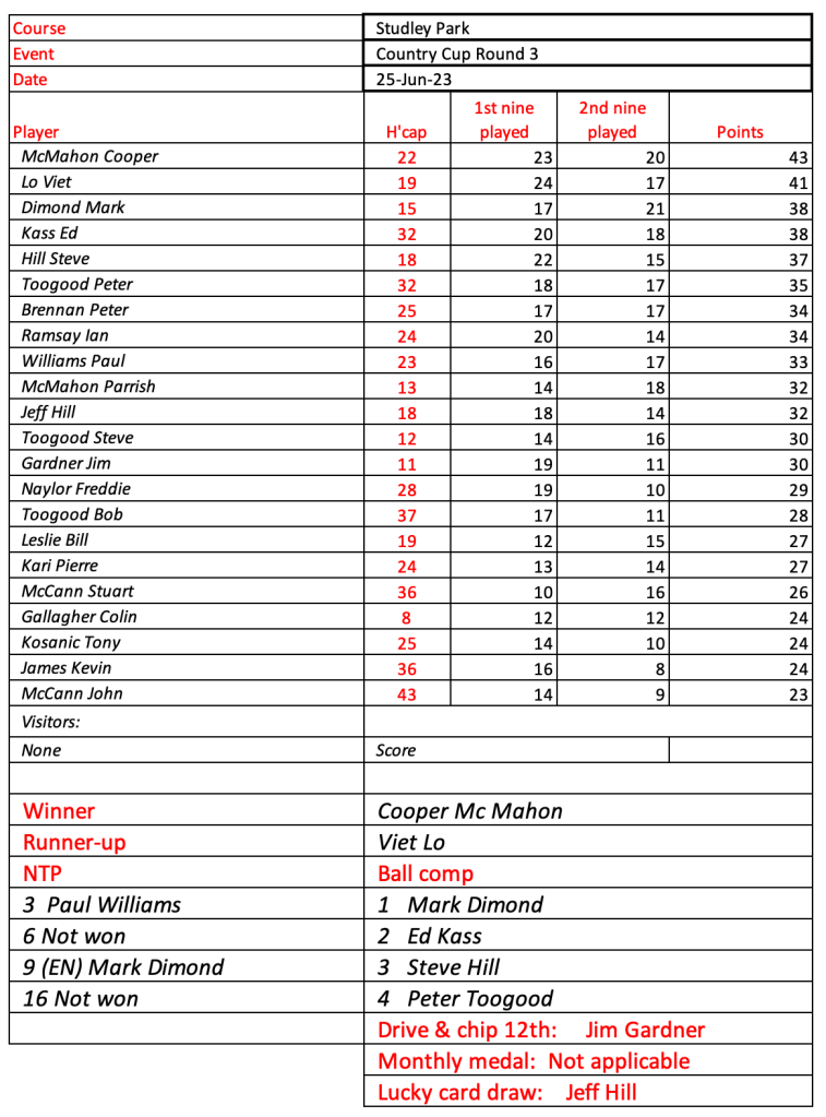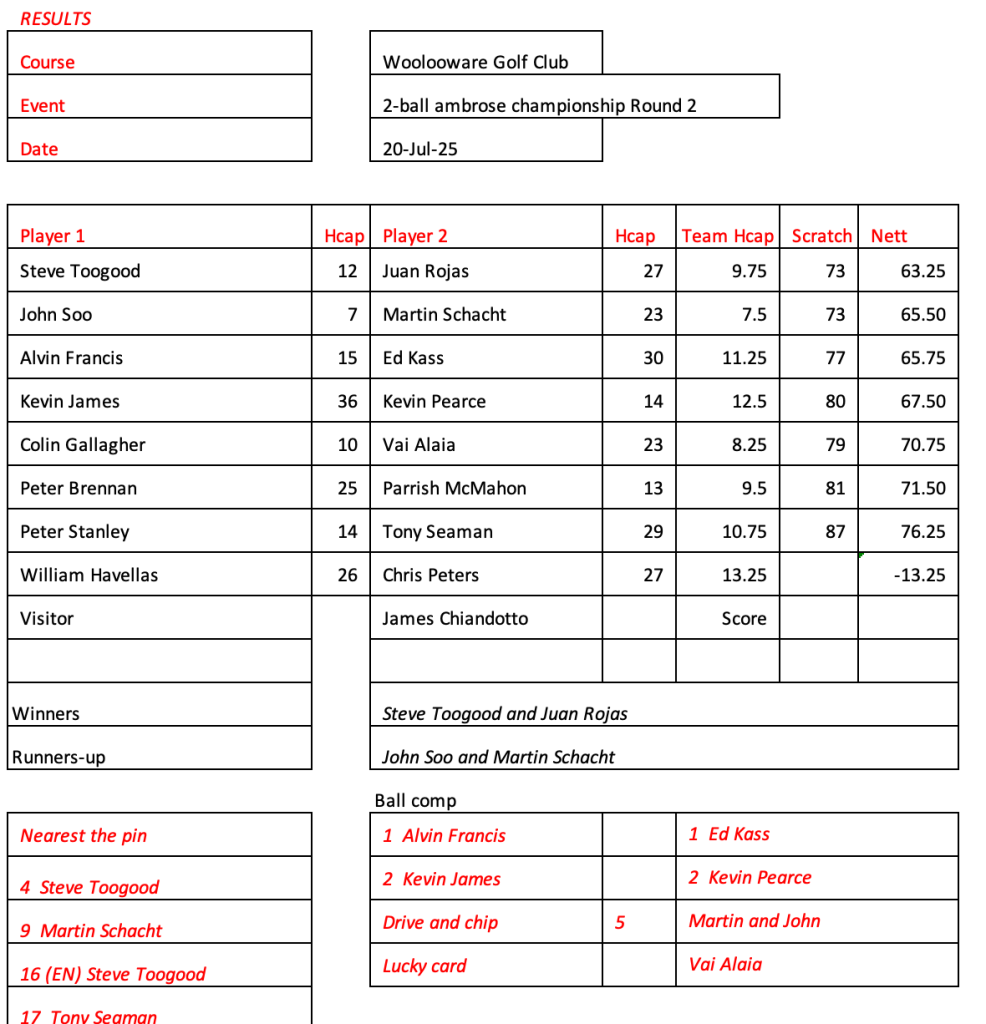 Just 12 brave souls at Fox Hills today as a result of the cart ban and persistent rain. Great to see Craig and Jason out for a game. Lots of unknowns on the start sheet for Woodville, let me know if you intend to play or not and whether you need a cart.