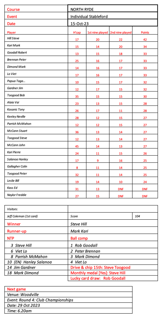 First outing at North Ryde proved difficult for some and game time was over the top. Congratulations to Steve Hill on his impressive 42 points for the win.