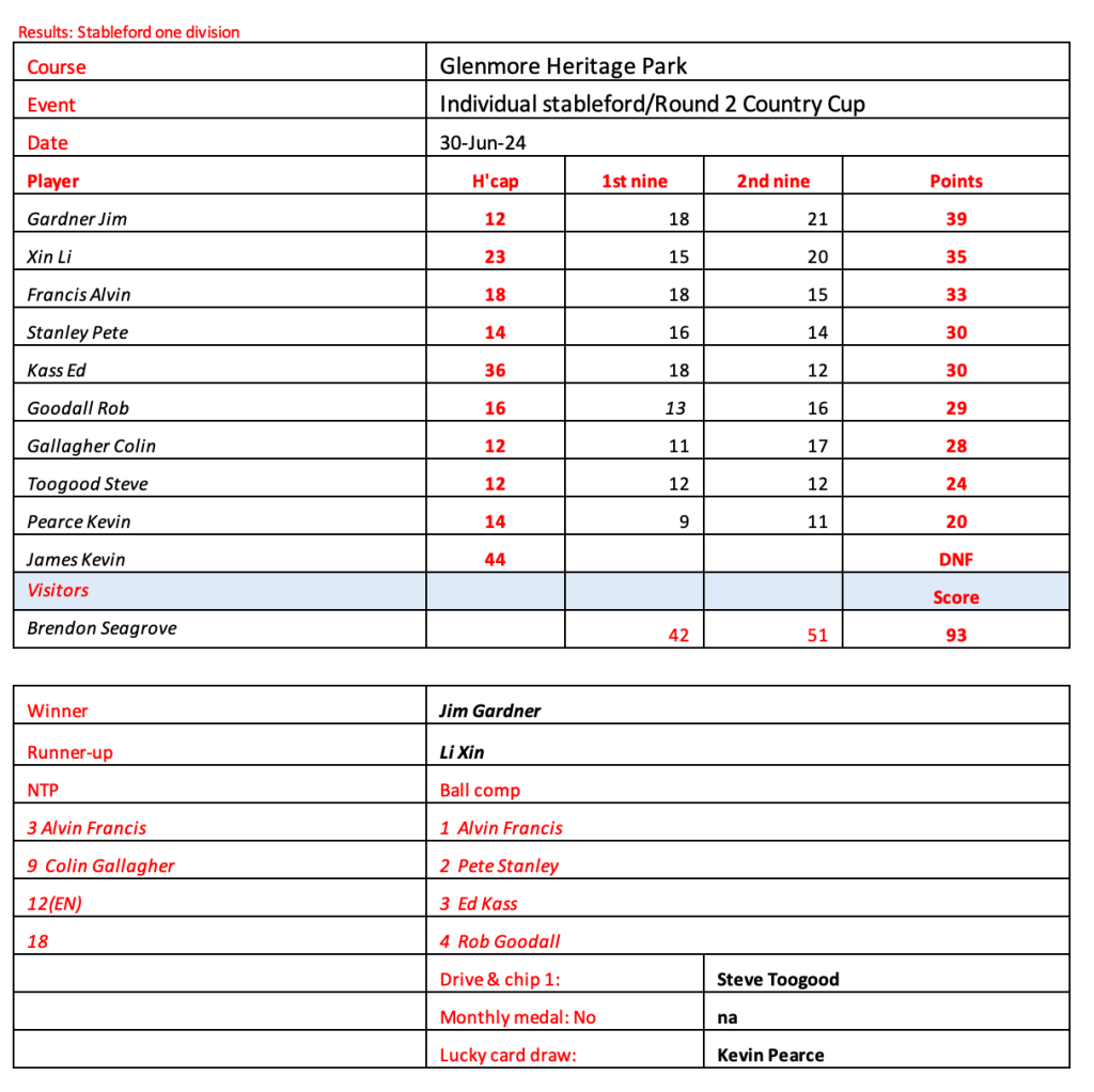 Not the best day for golf today with many dropping out due to the heavy rain. Eleven starters braved the conditions with Jim Gardner being the best to cope. Won the day and the Country Cup.